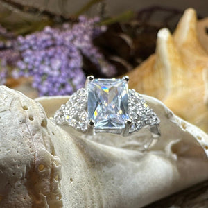 Solid Sterling Silver with a six carat faceted diamond zirconia with trinity knots on the sides.