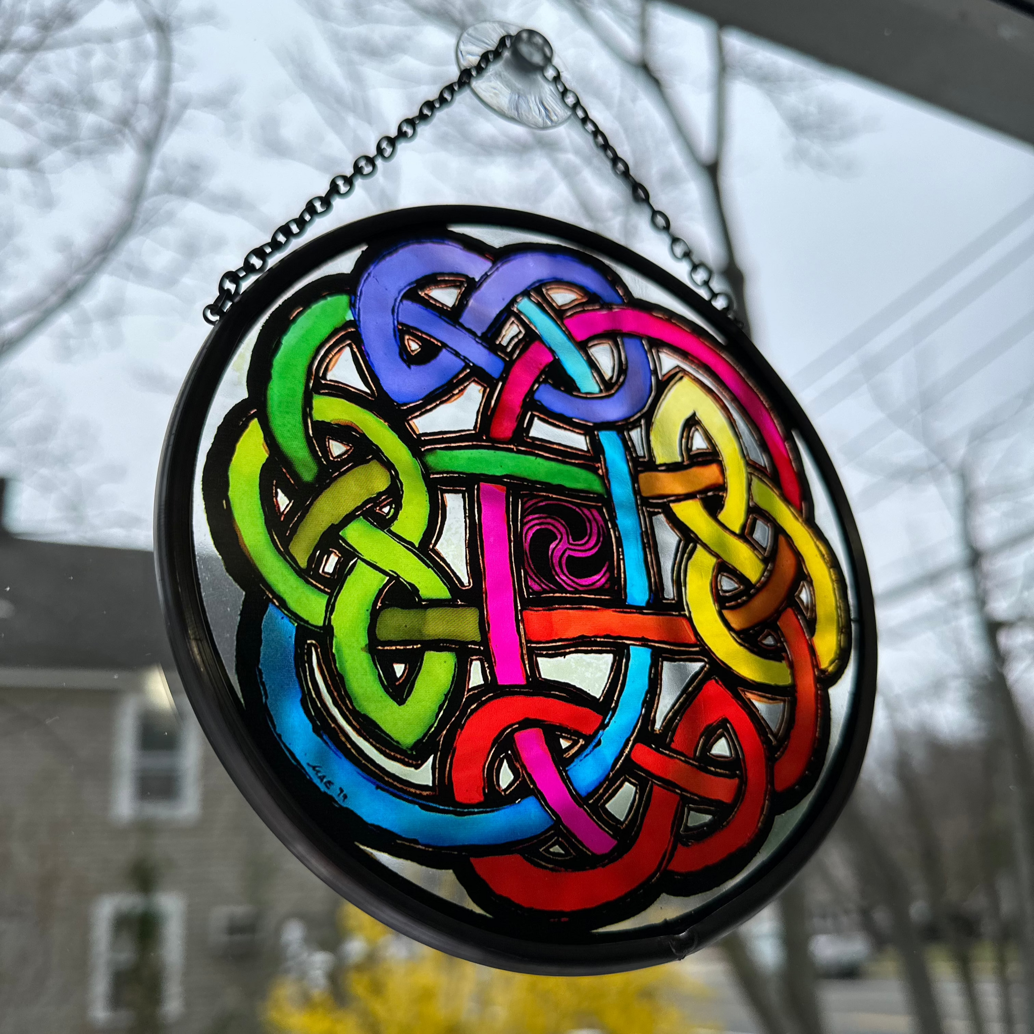 Colorful Hand-painted Stained Glass Celtic Window Panel for the wall or window.