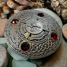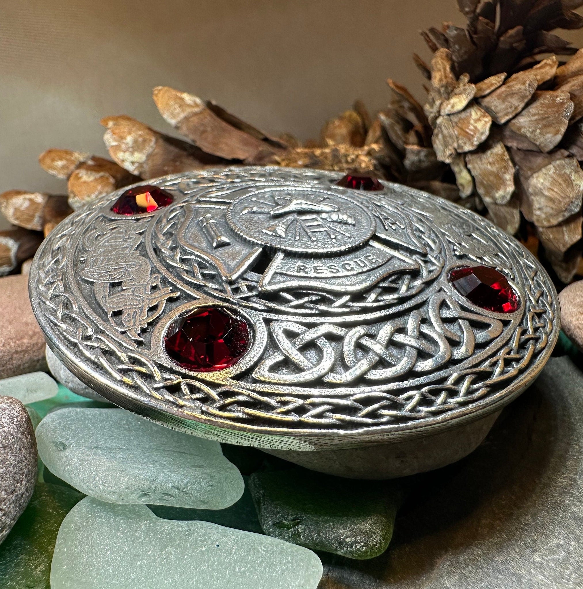 Crystal Celtic Fire Department Brooch – a pewter shoulder style brooch that has a large 1 inch center Fire & Rescue Badge and four surrounding crystals in red color.
