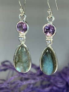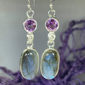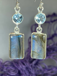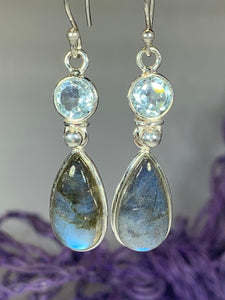 Beautiful Solid Sterling Silver Celtic Waters earrings with cool blue labradorite stone and faceted blue topaz or amethyst gemstone - a lovely dome shaped labradorite stone with authentic faceted gemstone accent - the cabochon labradorite (5 1/2 carat size on each earring) has the most gorgeous blue, gray and lilac color.