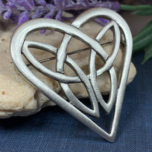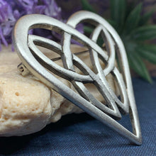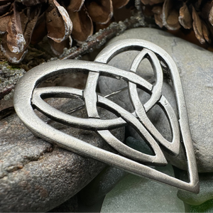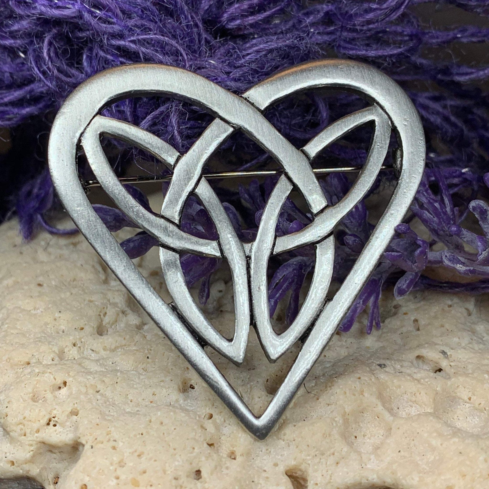 This beautiful brooch with its clean lines and Celtic design will win over the heart of any lover of Celtic culture. It would look wonderful on any coat, jacket, sweater or dress. A lovely way to say "I love you". Solid pewter with an antique finish.
