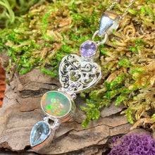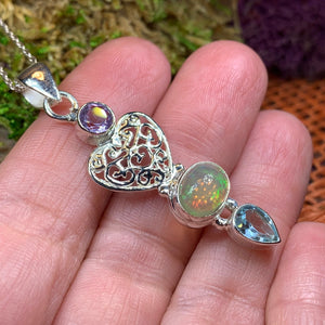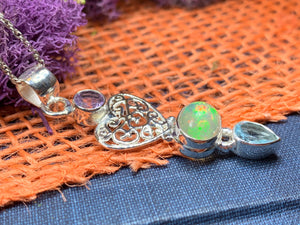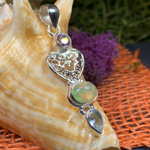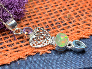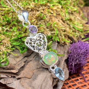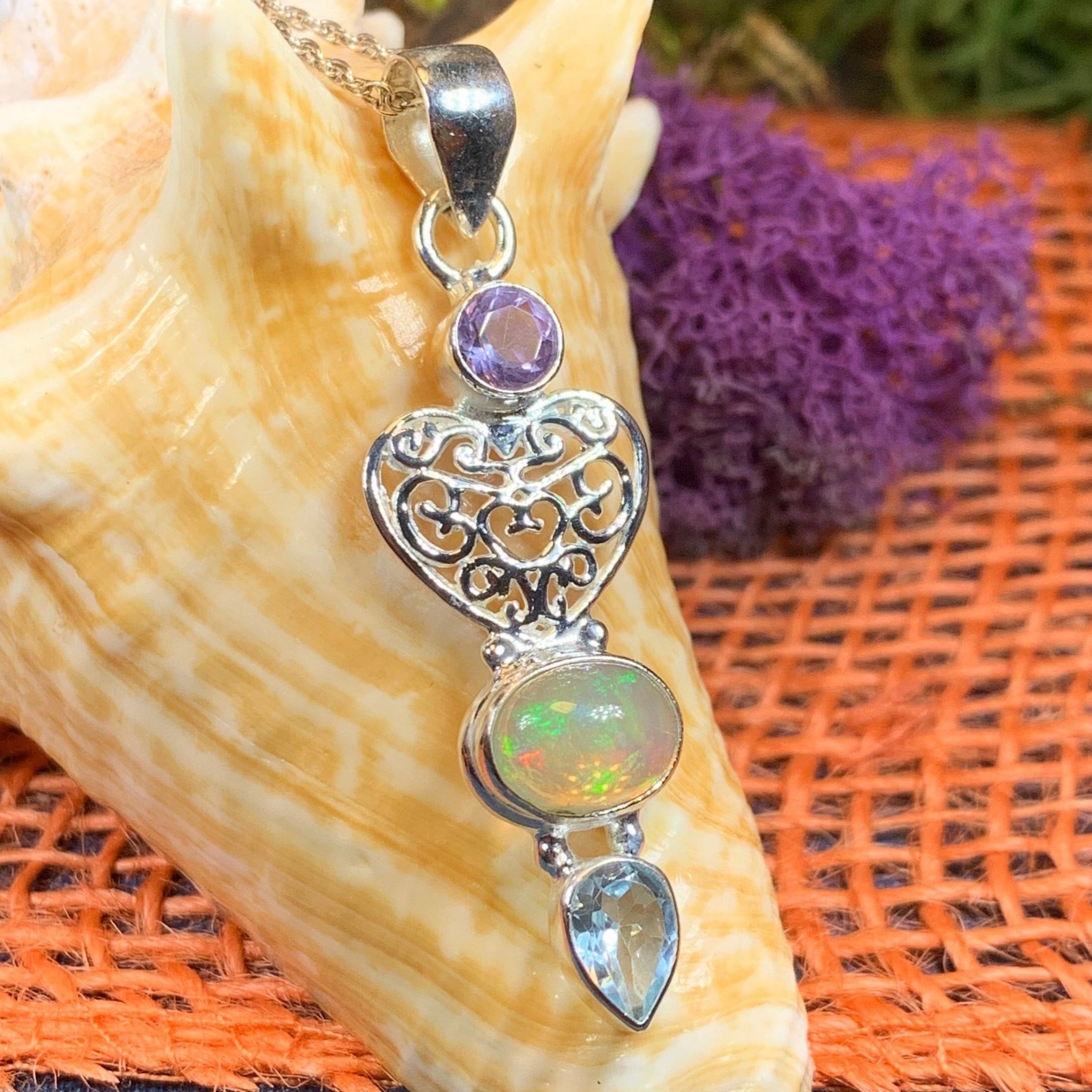 This Solid Sterling Silver natural Ethiopian opal, amethyst and garnet pendant is a high quality stone with amazing flashing color! The Ethiopian opal glows with blue, green and gold - a magical stone that is sure to delight your loved one! 2 carat opal stone with .5 carat amethyst and .5 carat garnet stone.