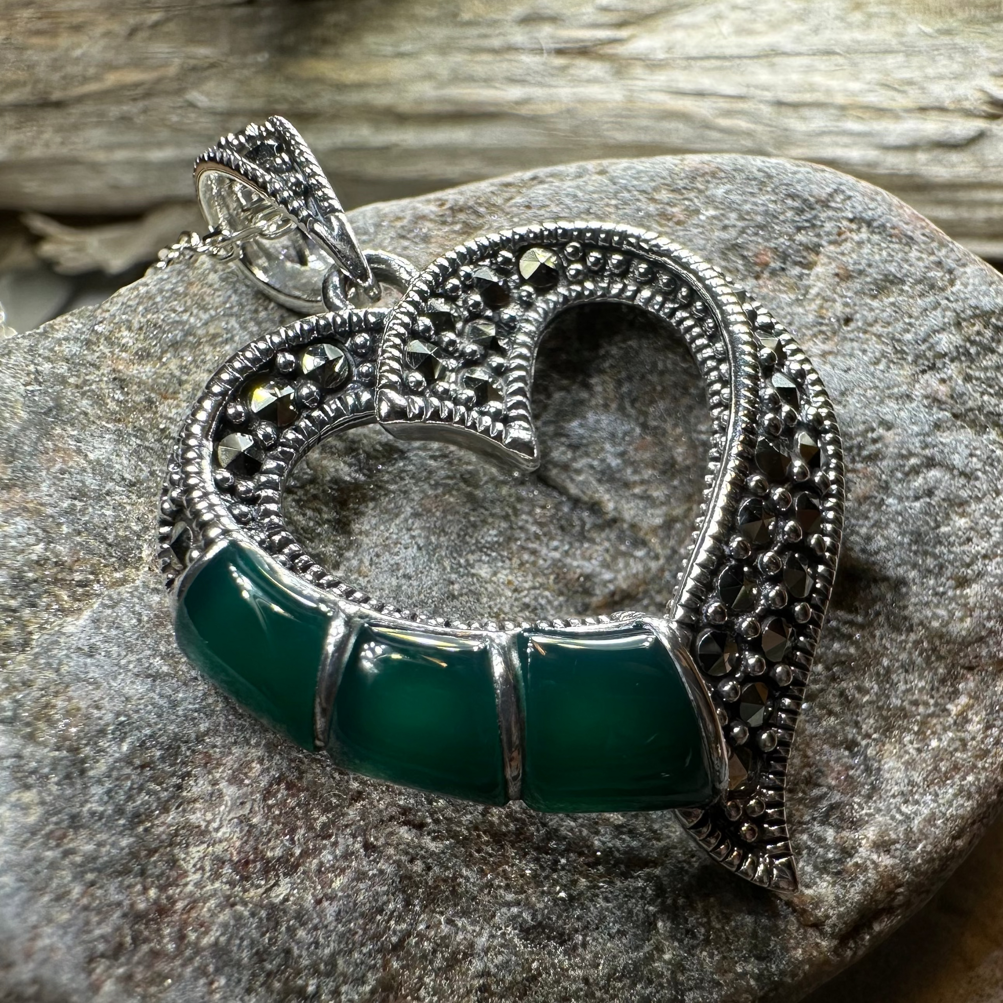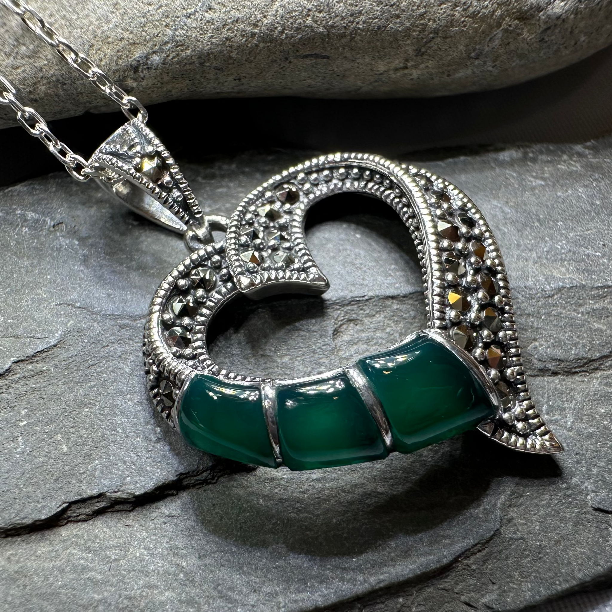 This elegant sterling silver pendant features a heart shape accented with shimmering marcasite stones, offering a delicate sparkle that enhances its timeless appeal.