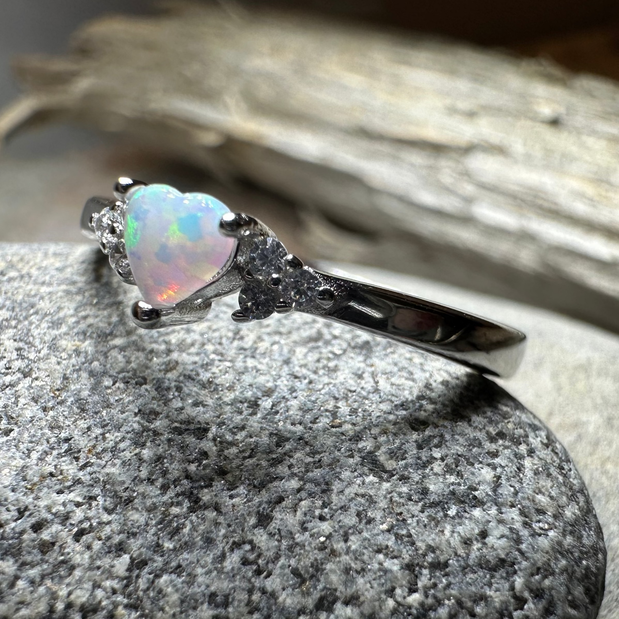 A petite design combining shining sterling silver with a glowing heart white fire opal - solid sterling silver. The petite design of this ring is perfect for people with smaller hands or for those who enjoy minimalist jewelry.