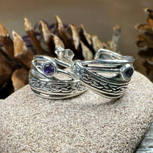 Solid Sterling Silver Celtic Hoop Earrings with authentic amethyst gemstone