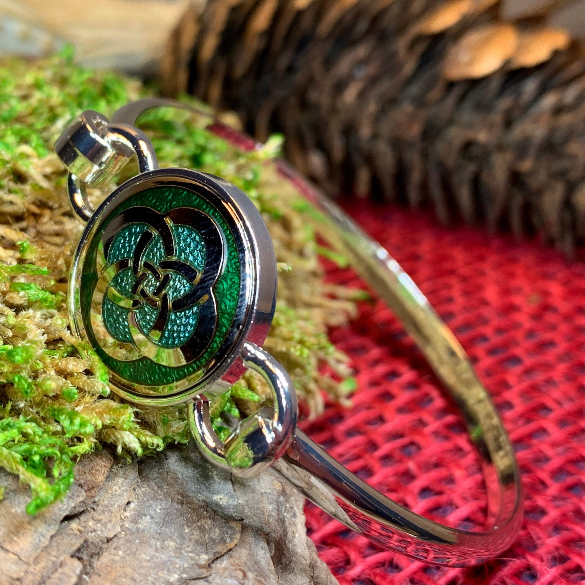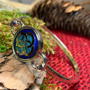Stunning! Our Celtic Knot Bangle Bracelet features an ancient Celtic Dara Knot design that goes back thousands of years, embraced on both sides by a Celtic knot work pattern. Will never tarnish. Focal piece opens and closes on hook to allow for easy on and off. A beautiful gift!