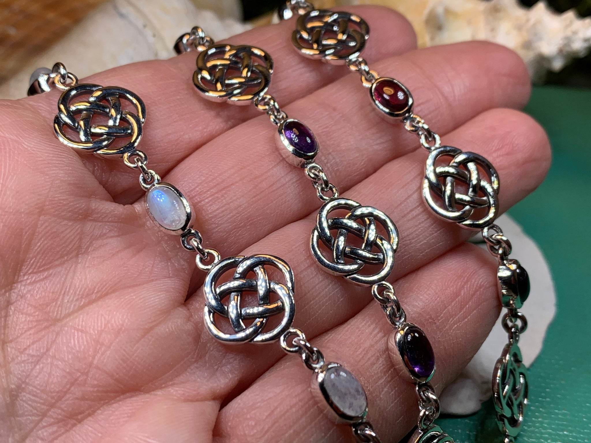 This feminine Celtic Dara Knot Bracelet celebrates the beauty of nature with solid sterling silver and five 1/2 carat GRADE AAA gemstone cabochon stones (5 stones on the bracelet).