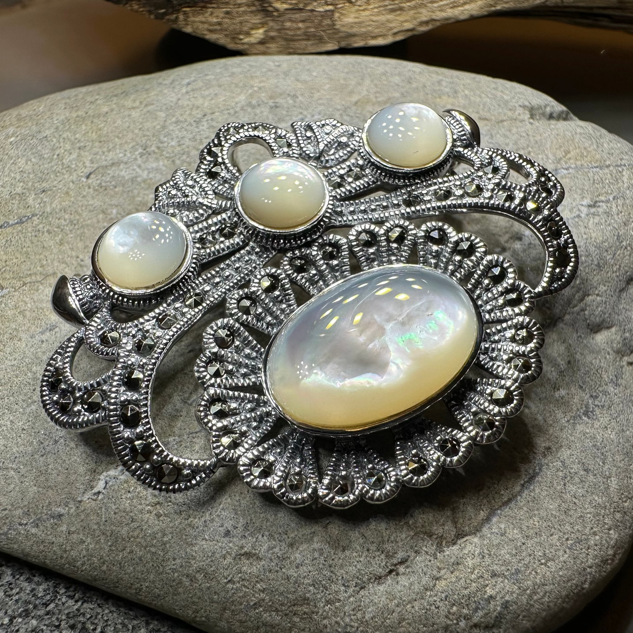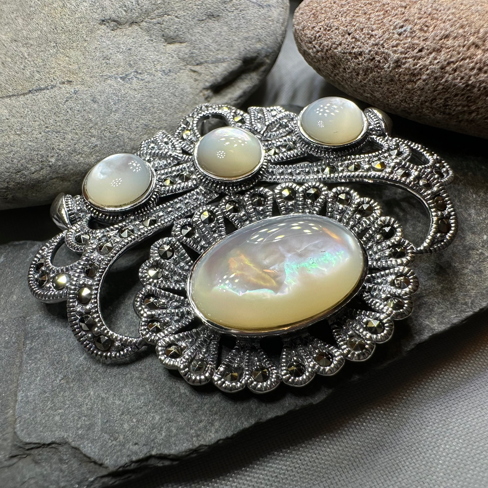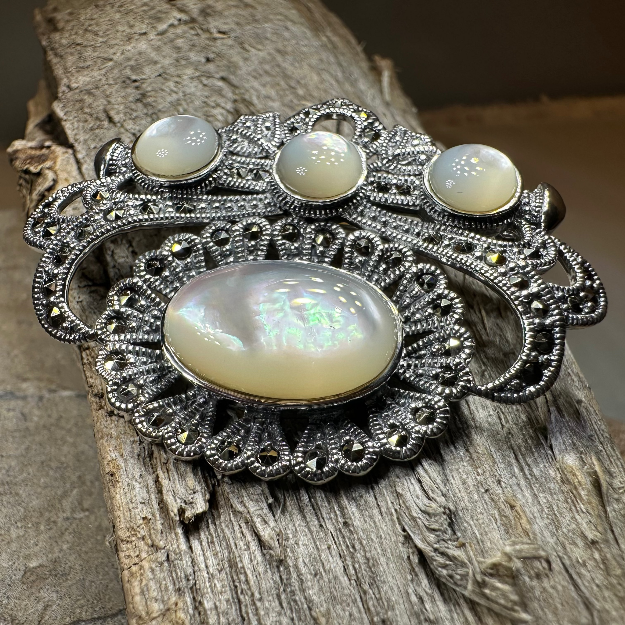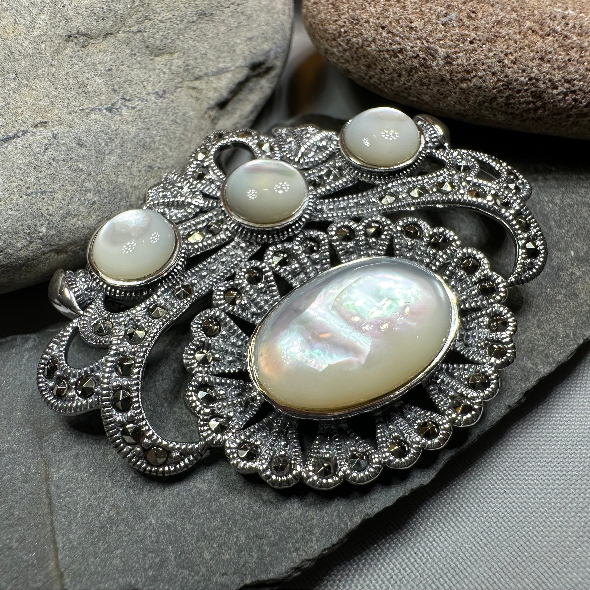 Solid Sterling Silver Celtic Brooch with detailed Celtic knotwork and authentic mother of pearl cabochons and sparkling marcasite gemstones. A beautiful vintage style finish that is perfect for any lover of Celtic culture!
