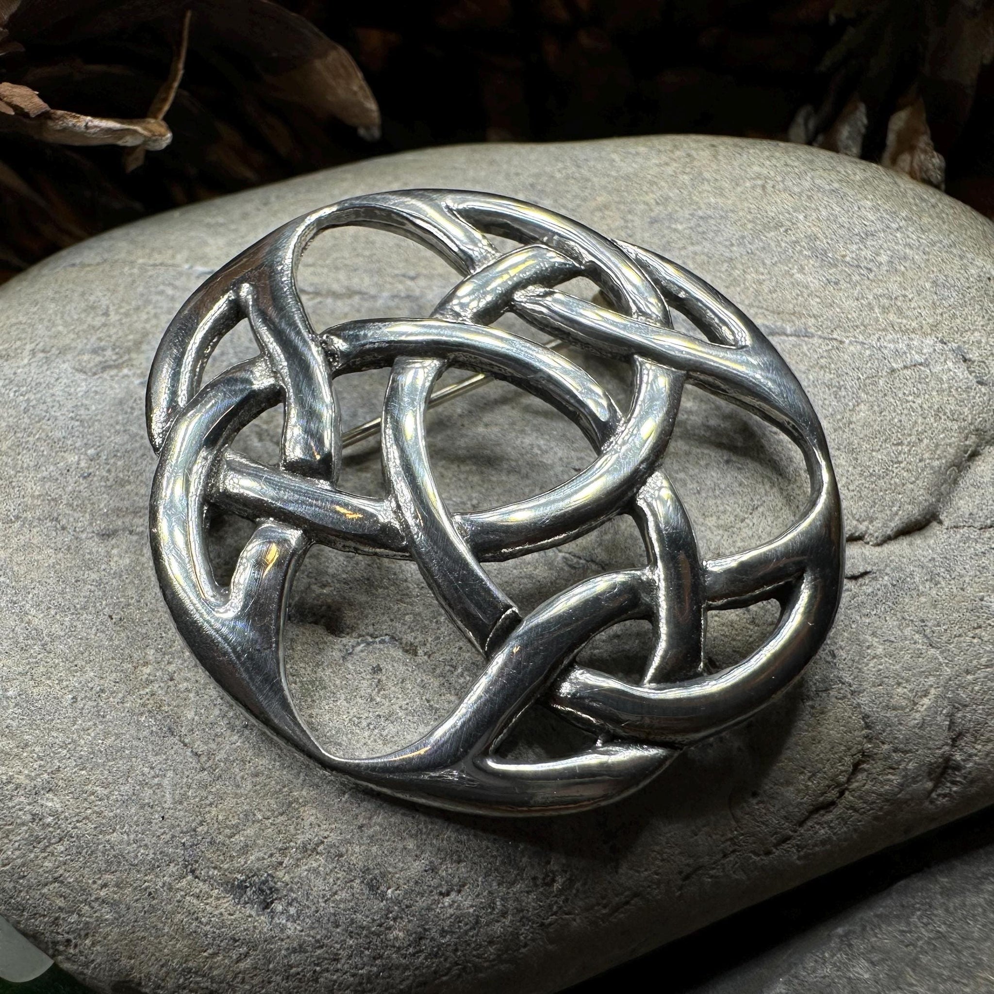 Celtic Pewter Brooch with detailed Celtic knotwork and spirals. A beautiful highly polished finish that is perfect for any lover of Celtic culture! This 1 1/2" x 1 1/2" brooch has a sturdy 1" pin to adorn any cape, wrap, kilt or decorate a coat or jacket.