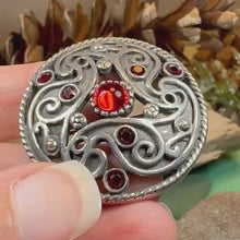 The colorful center stone glows and faceted crystals gives this brooch a special touch. Solid lead-free pewter.