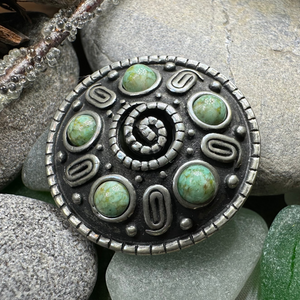 An antique finished pewter shoulder style brooch that has five amethyst crystals or five green marble cabochons. A beautifully detailed brooch that will be a real attention getter!