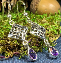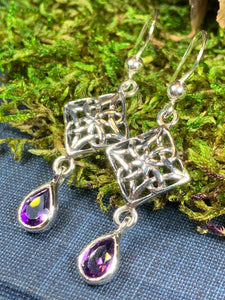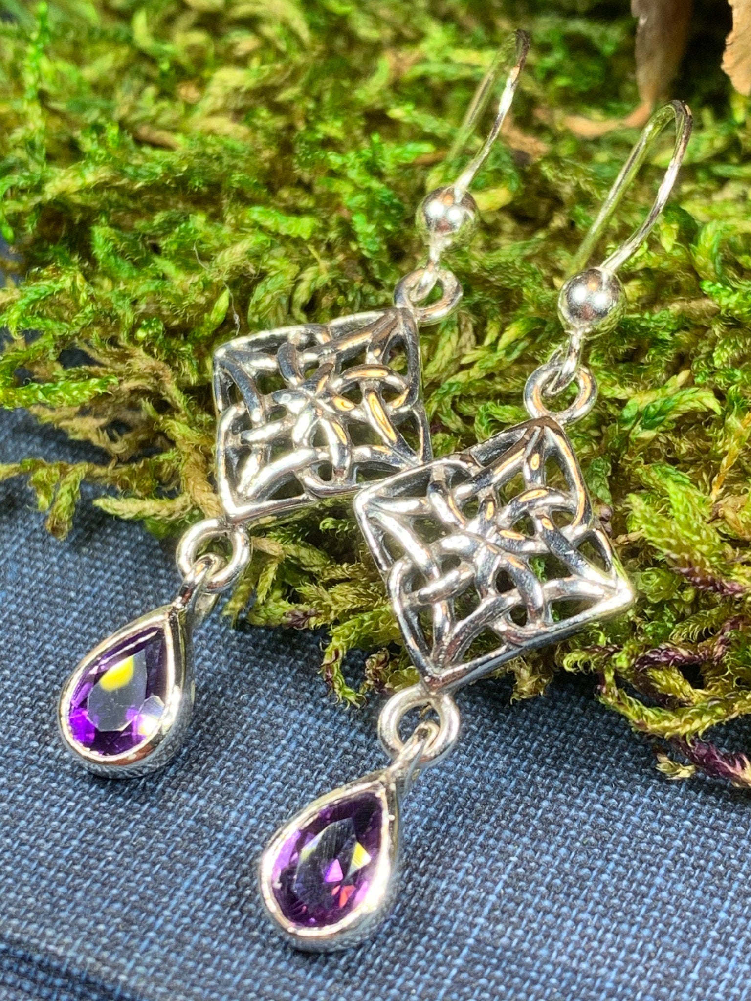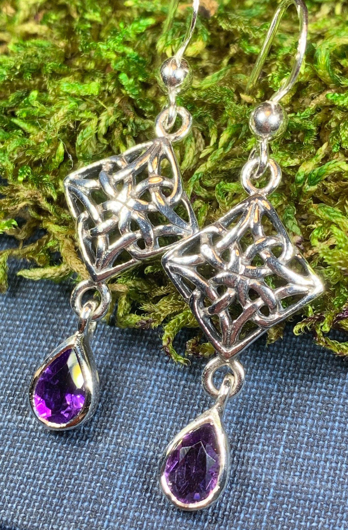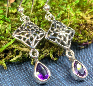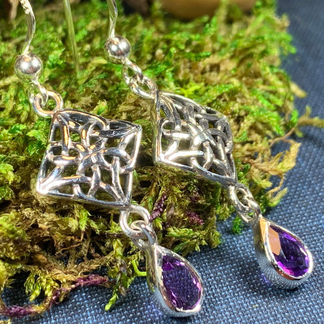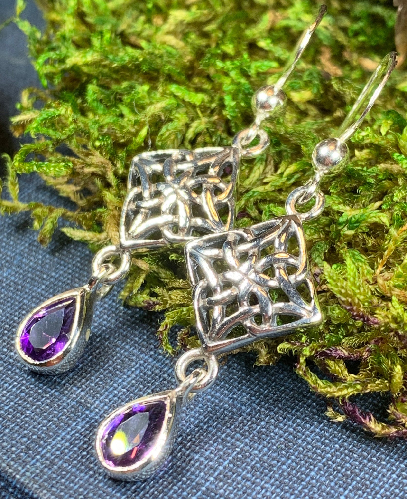 The Marinda Celtic Knot Earrings are a symbol of eternal life and enduring love, adorned with two stunning 1 carat Grade AAA amethysts that add a touch of sophistication and elegance. Their deep purple hue adds a regal and alluring element to these exquisite earrings.
