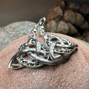 With its unmistakable design, this timeless symbol is embodied in these earrings, incorporating the feminine and intriguing qualities of the trinity knot with the elegant glitter of marcasite gemstones.