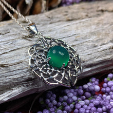 The lovely, rich glow of the 1 carat center green agate gemstone creates a unique pendant that is feminine and intricate. The glow of the green will have you dreaming of Ireland!