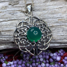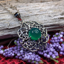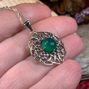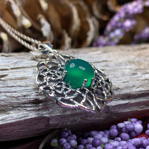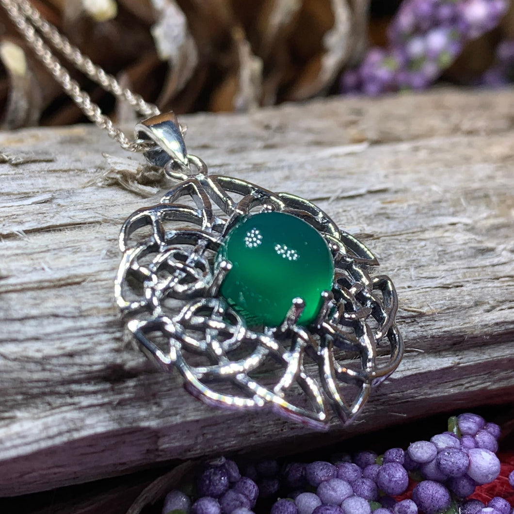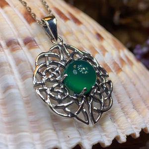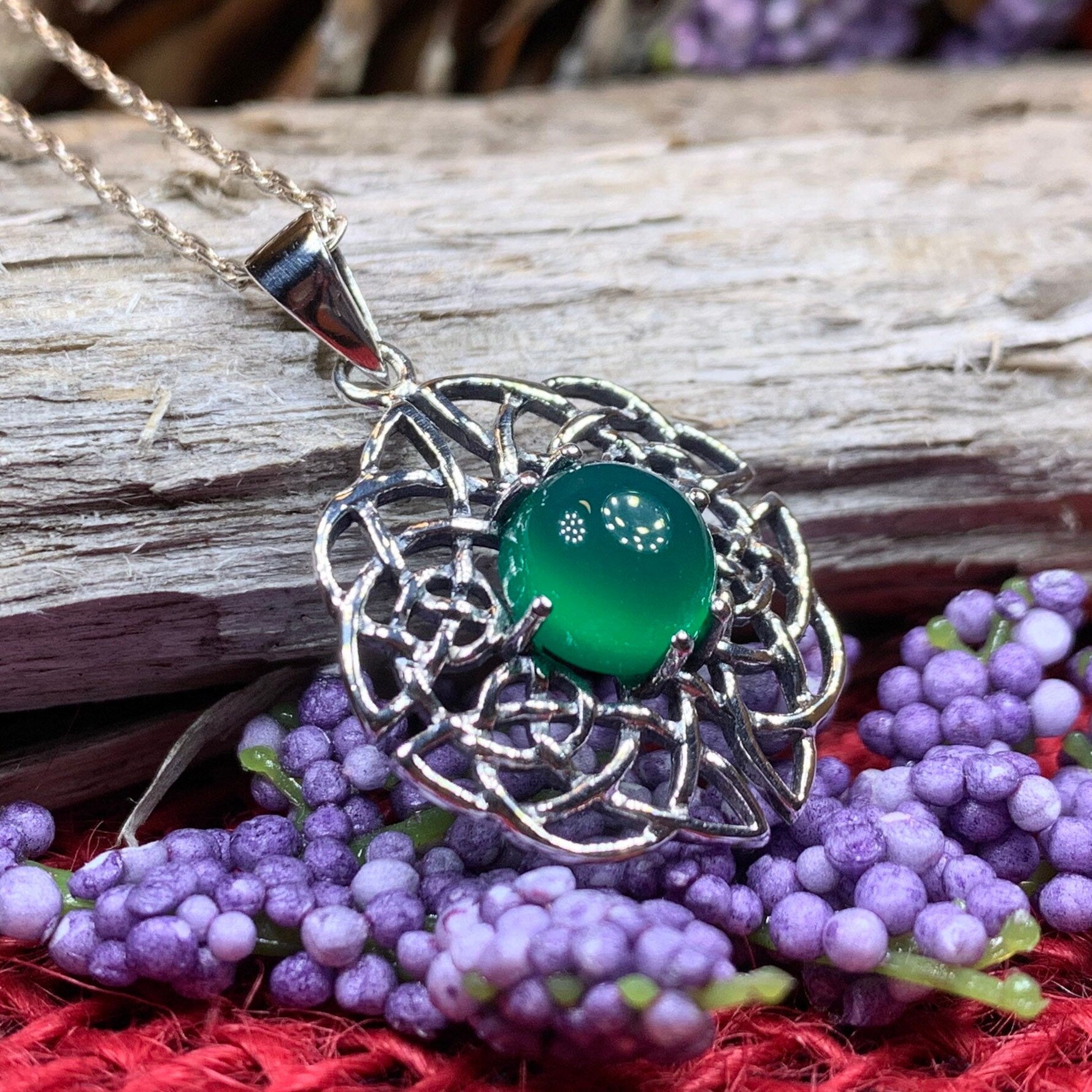 This Celtic pendant is called Elvenfire because of the deep, magical glow of the green agate. With its intricate open knot work and beautiful presence it is a show stopper!