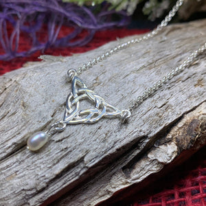 The delicate Celtic knotwork is made even more attractive with a feminine freshwater pearl dangle.