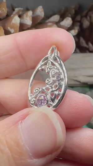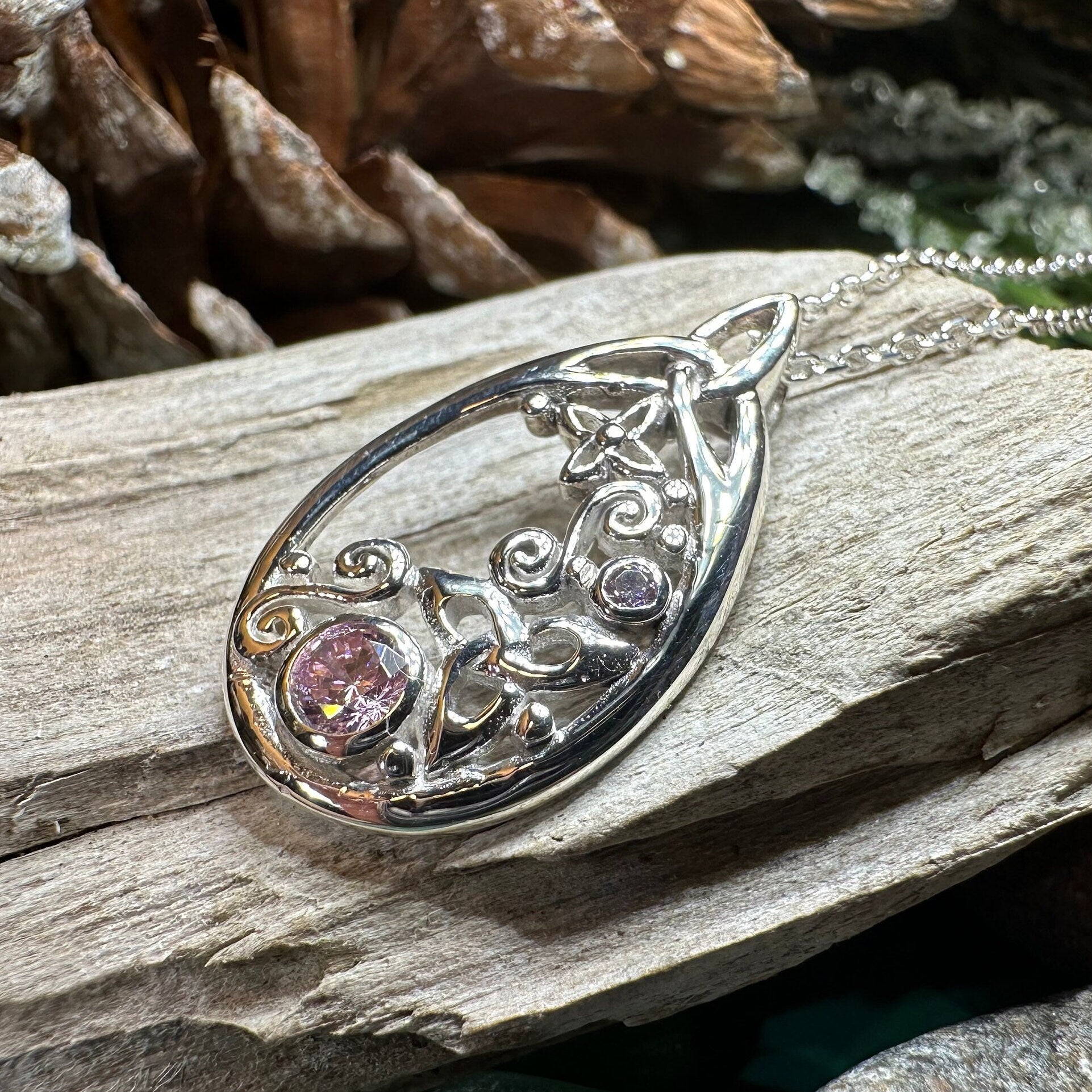 Solid Sterling Silver Celtic Necklace with trinity knots and faceted pink topaz.