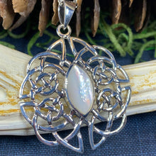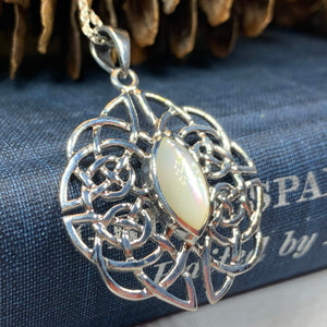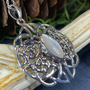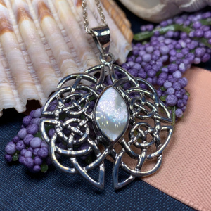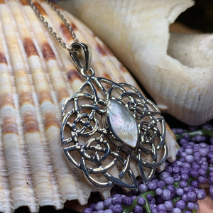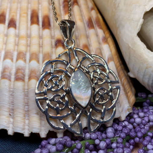 This Celtic pendant is called Life's Love because it is meant for the one who is the love of your life. With its intricate open knot work and beautiful presence it is a show stopper! The lovely, creamy glow of the 1/2" center Mother of Pearl inset creates a unique pendant that is feminine and intricate.