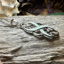 This piece must be seen in person! The high polish of the Celtic knot combined with the Infinity symbol with the bright lab-created opal inset really makes this unique piece shine.