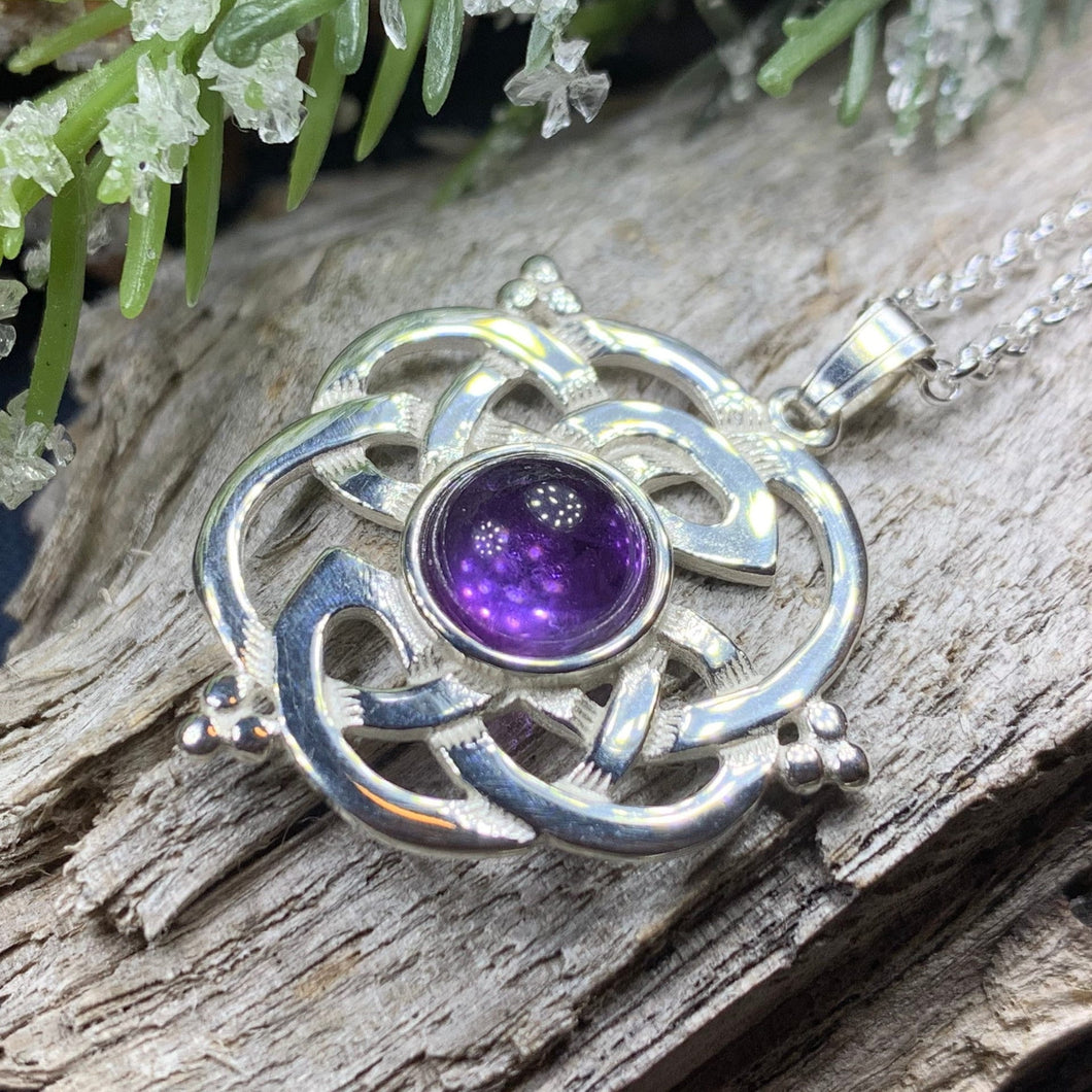 This solid sterling silver pendant features an elegant Celtic knot work design and a faceted genuine amethyst gemstone (2 carat) - an artful rendition of the traditional Celtic knot.