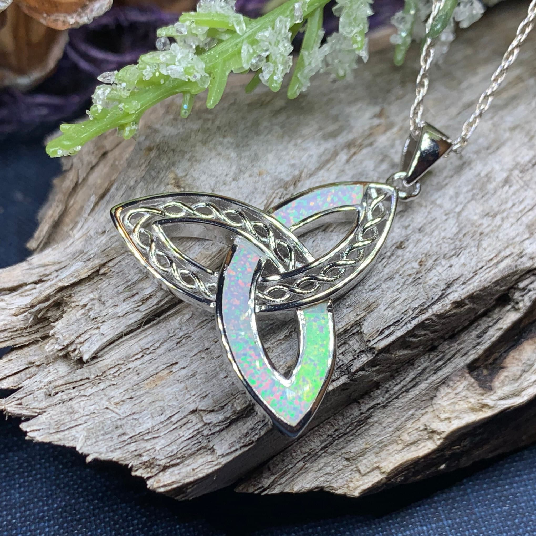This piece must be seen in person! The high polish of the Celtic knot with the bright lab-created opal inset really makes this unique piece shine.