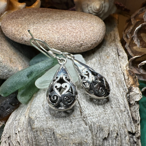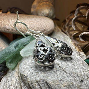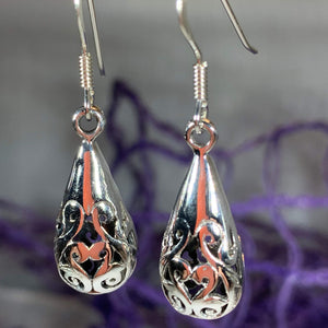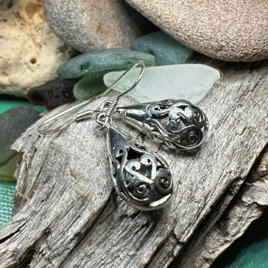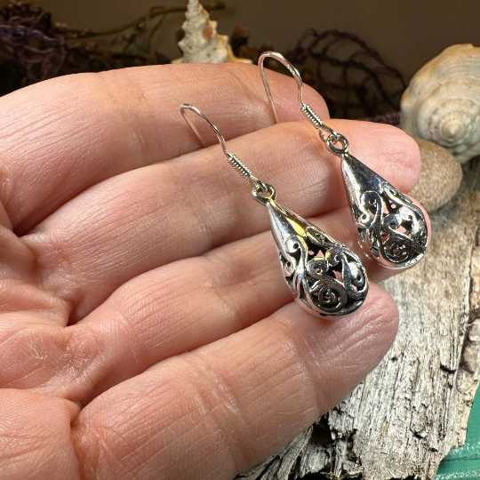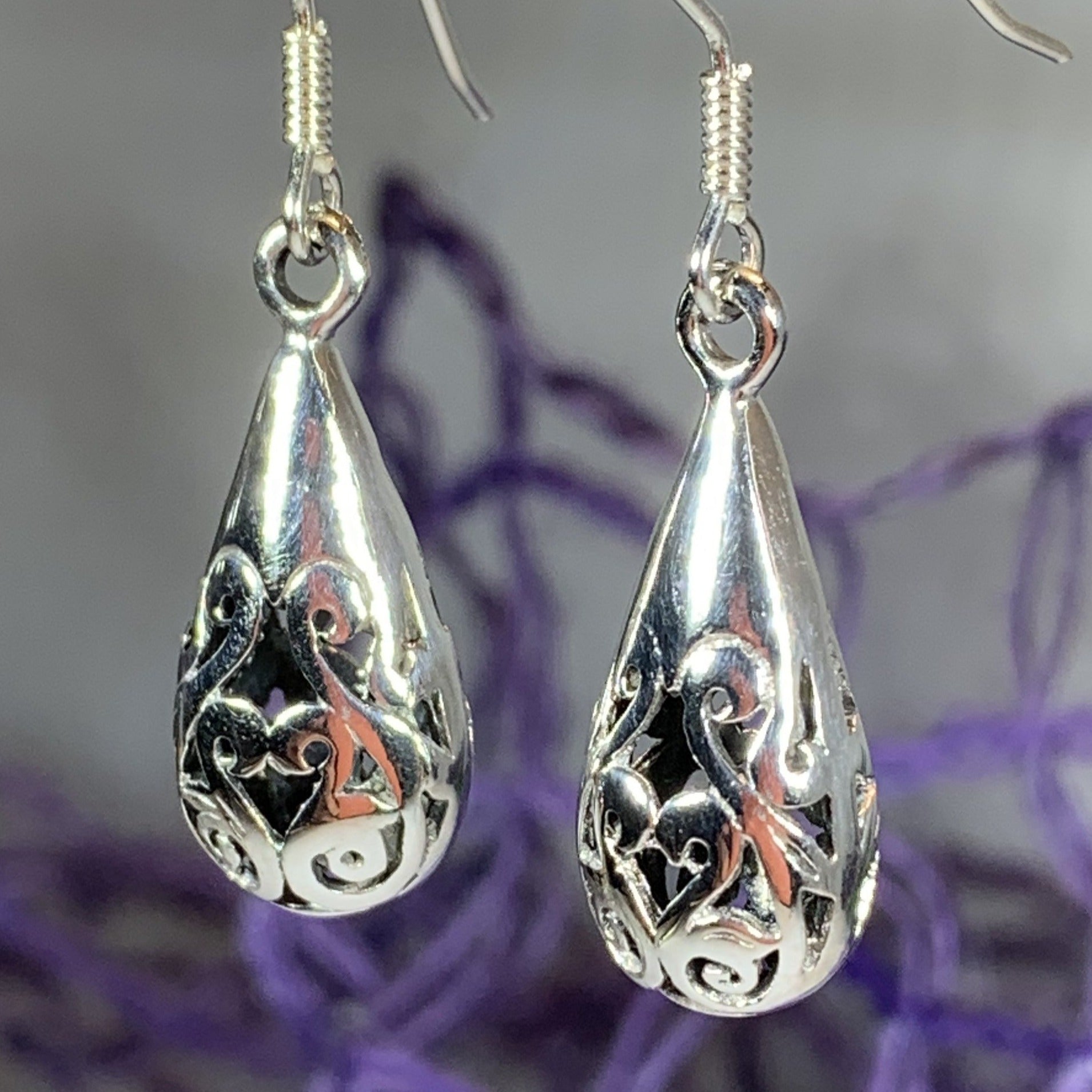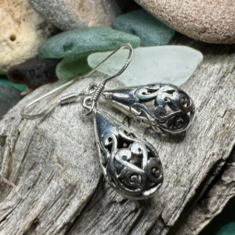 A beautiful and intricate design that is very special and unique. The gemstone "raindrop" dangle will catch the light and glow with a beautiful color. The push back closure makes these classy earrings easy to wear.