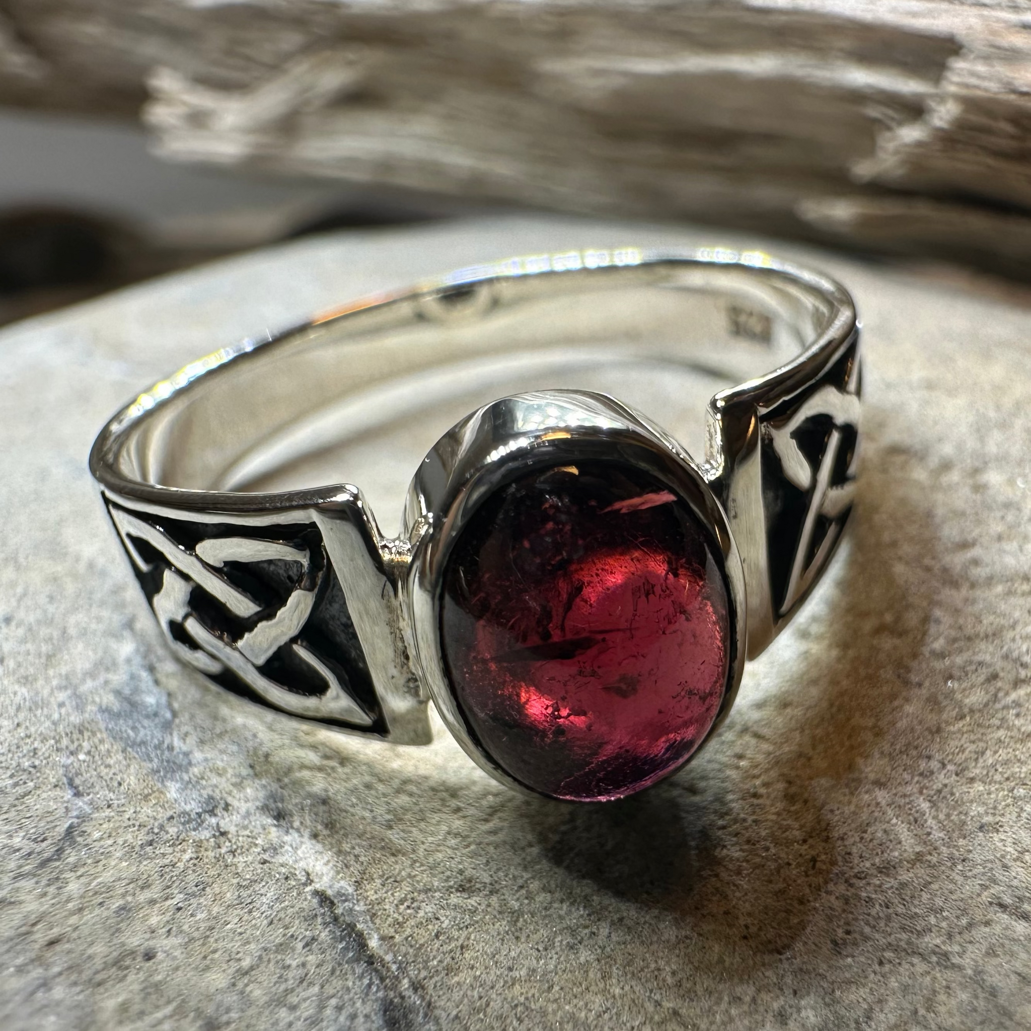 A unique design combining the traditional elements of the Celtic knot with a modern twist - solid sterling silver with a beautiful cabochon natural garnet stone that glows with a gorgeous deep color.