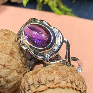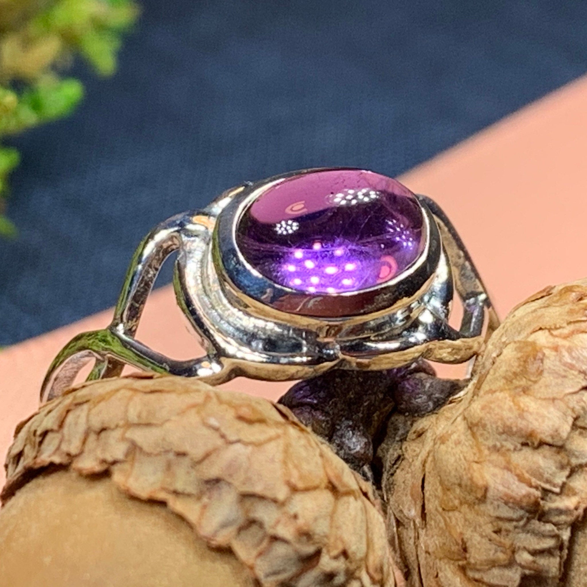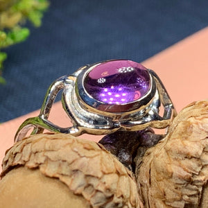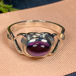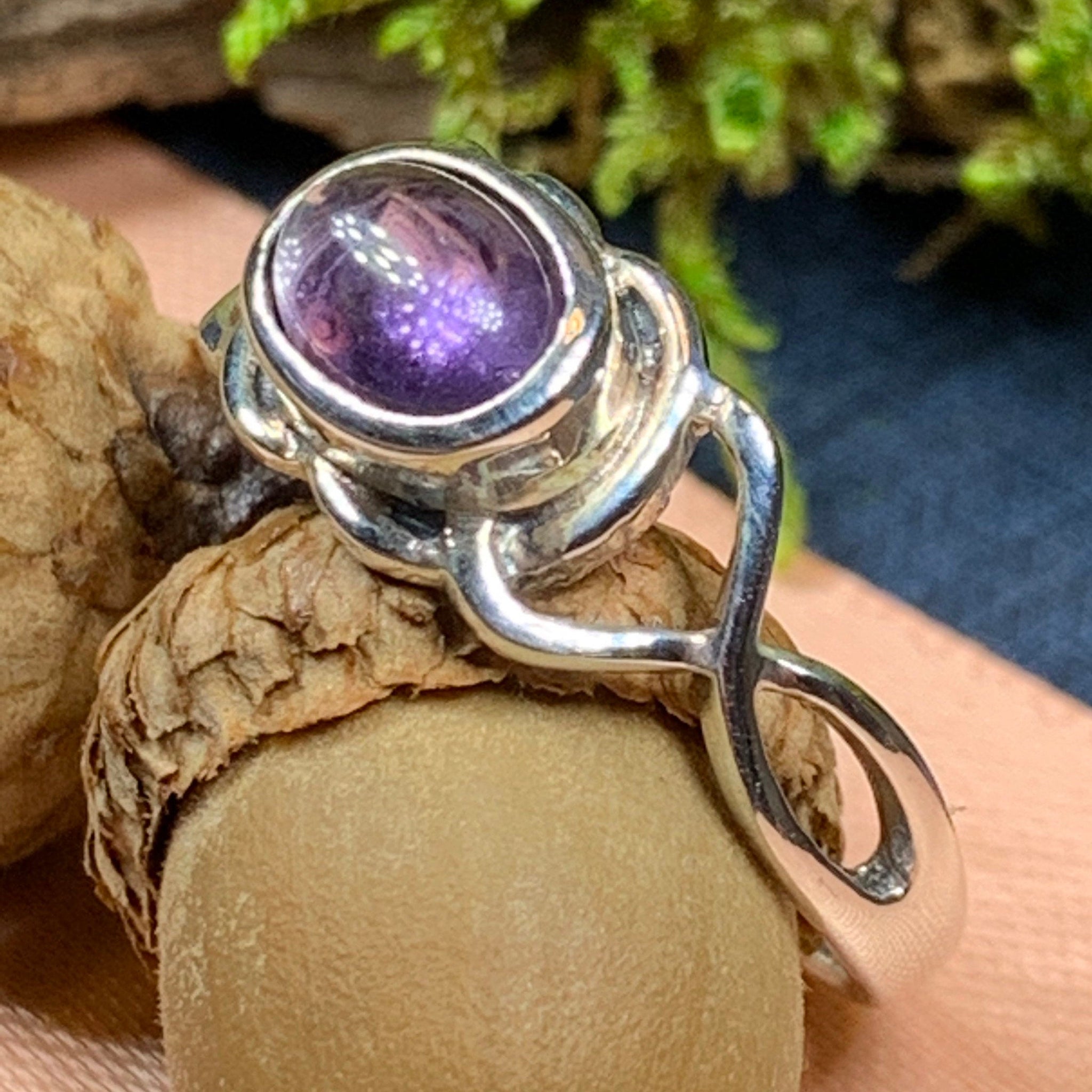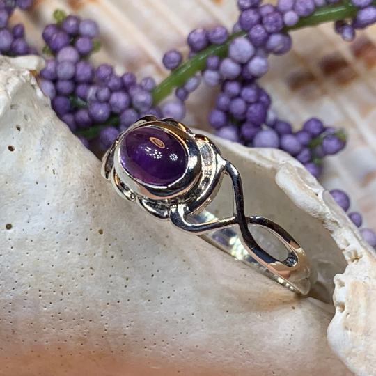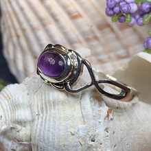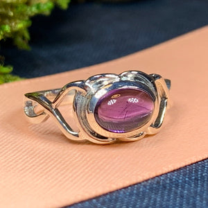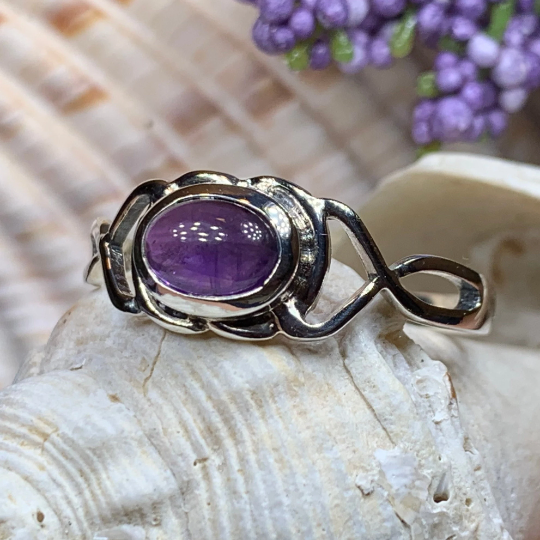A unique design combining the traditional elements of the Celtic knot with a modern twist - solid sterling silver with a beautiful large, cabochon natural amethyst stone that glows with a gorgeous purple color.