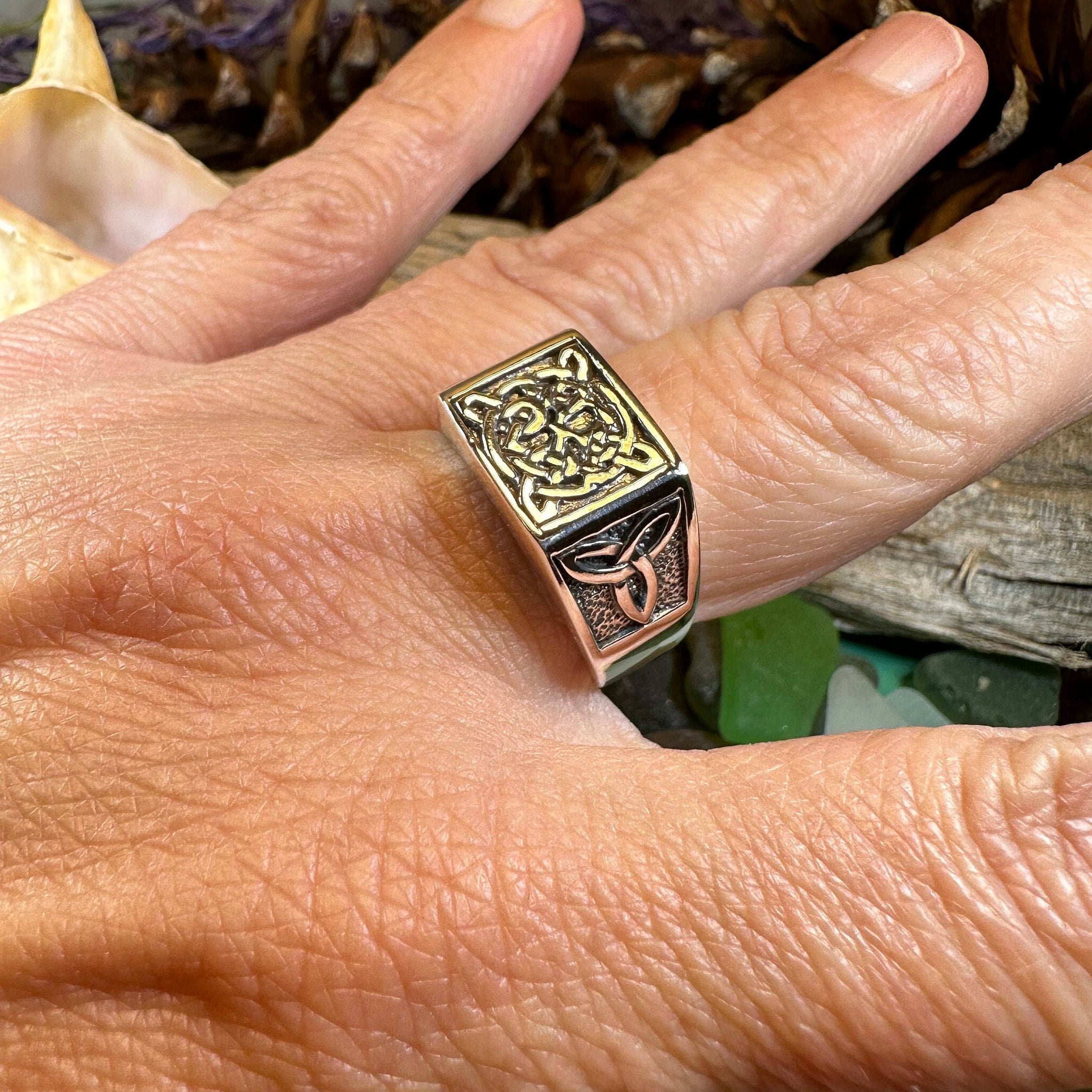 Ring face is 1/2" wide x 1/2" long with trinity knots on the sides.