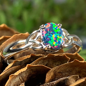 This distinctive piece artfully merges the classic trinity knot motif with vivid colors, featuring solid sterling silver and an oval lab-created blue opal.