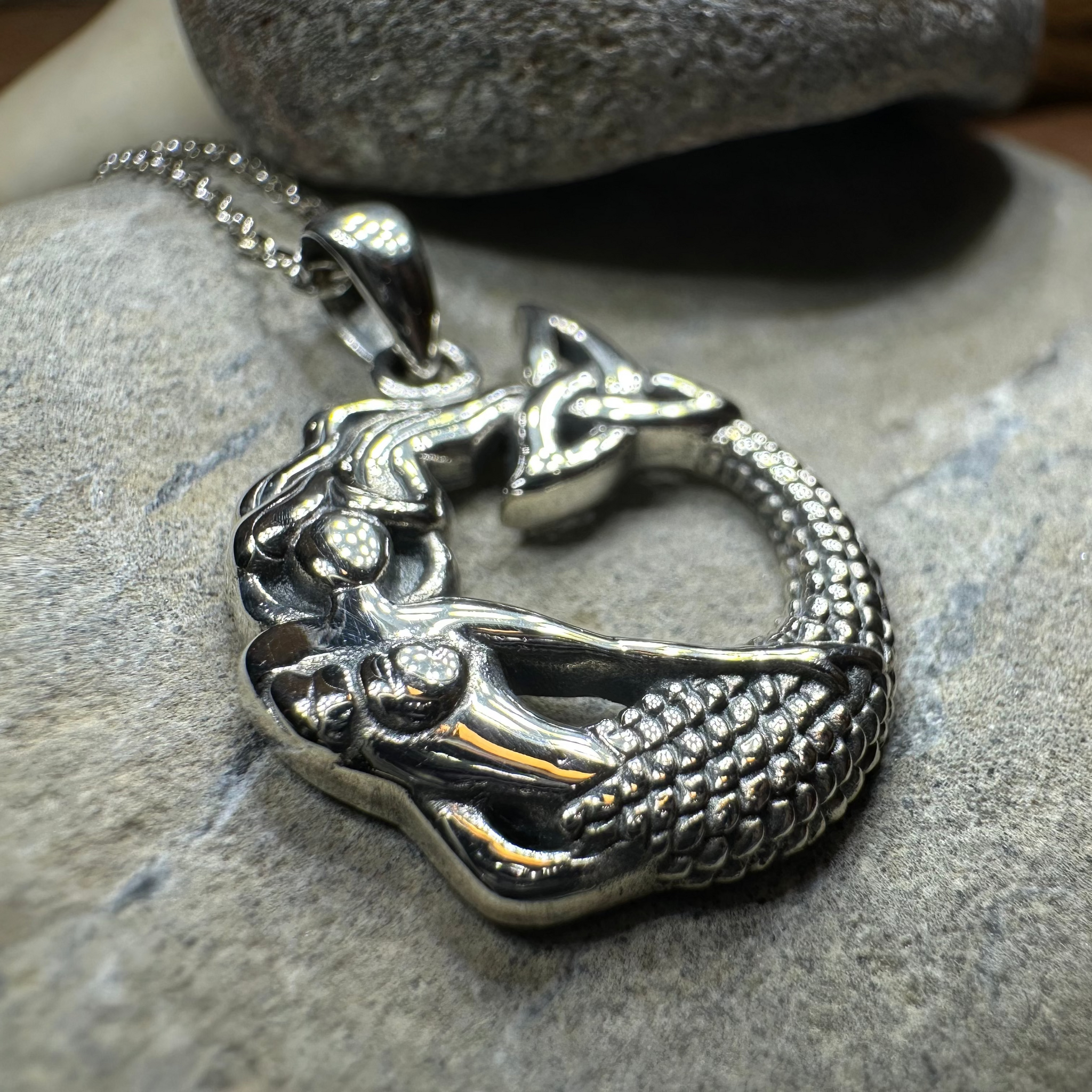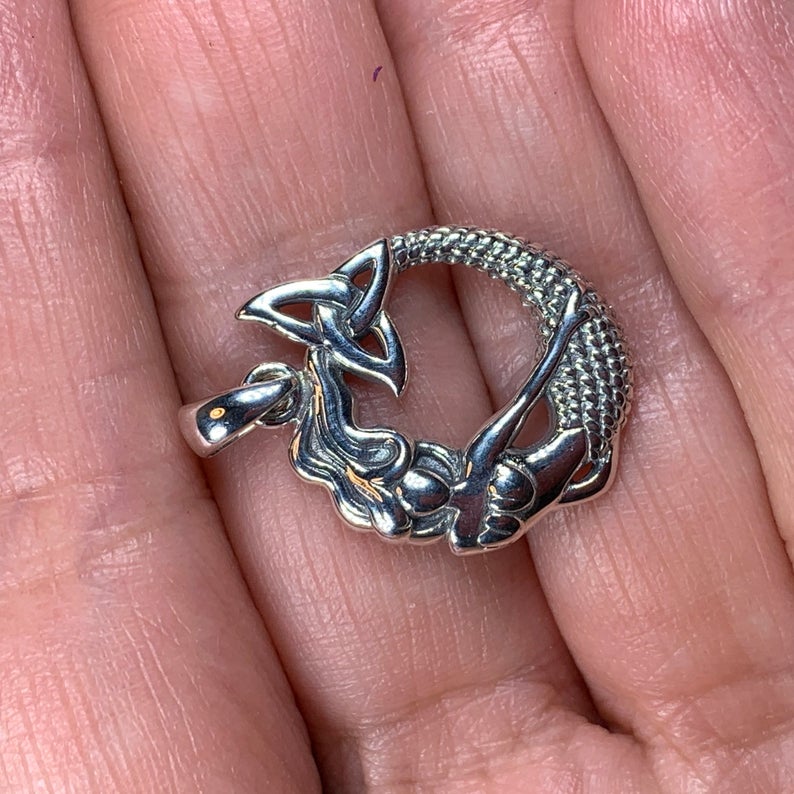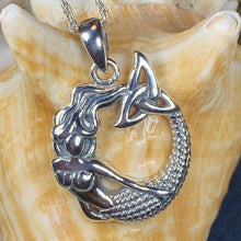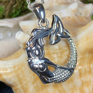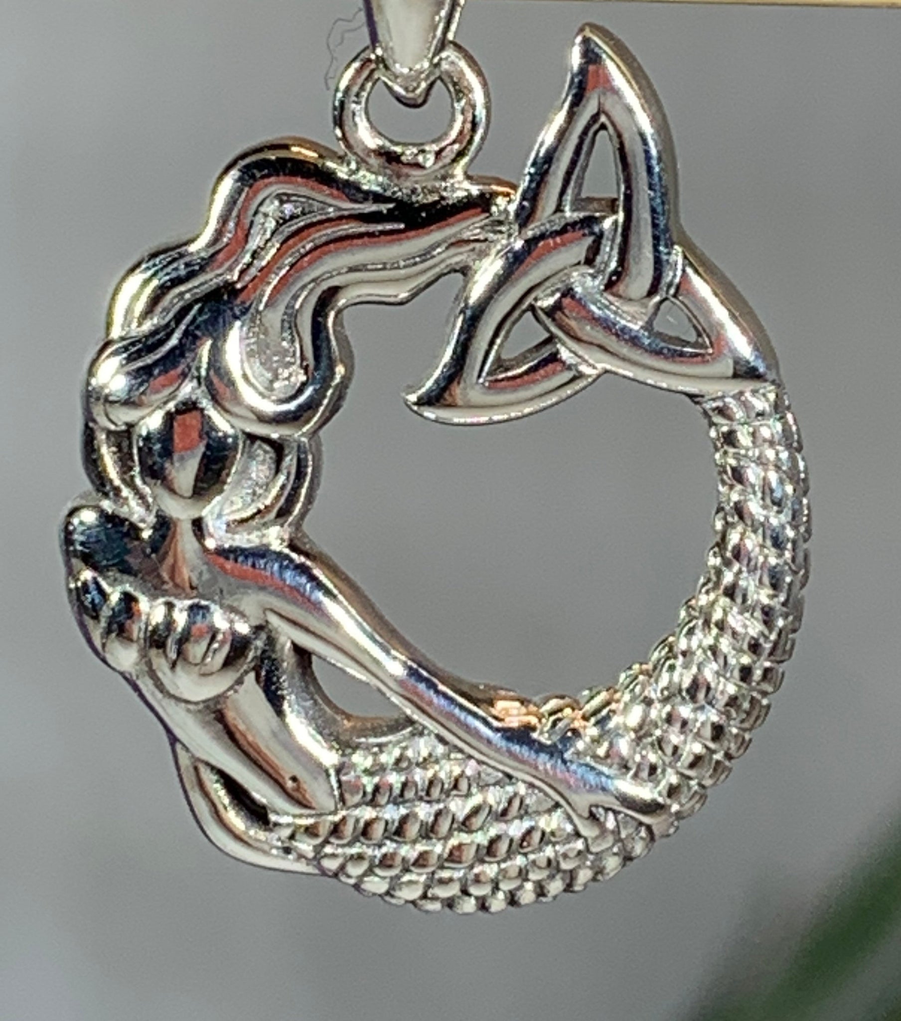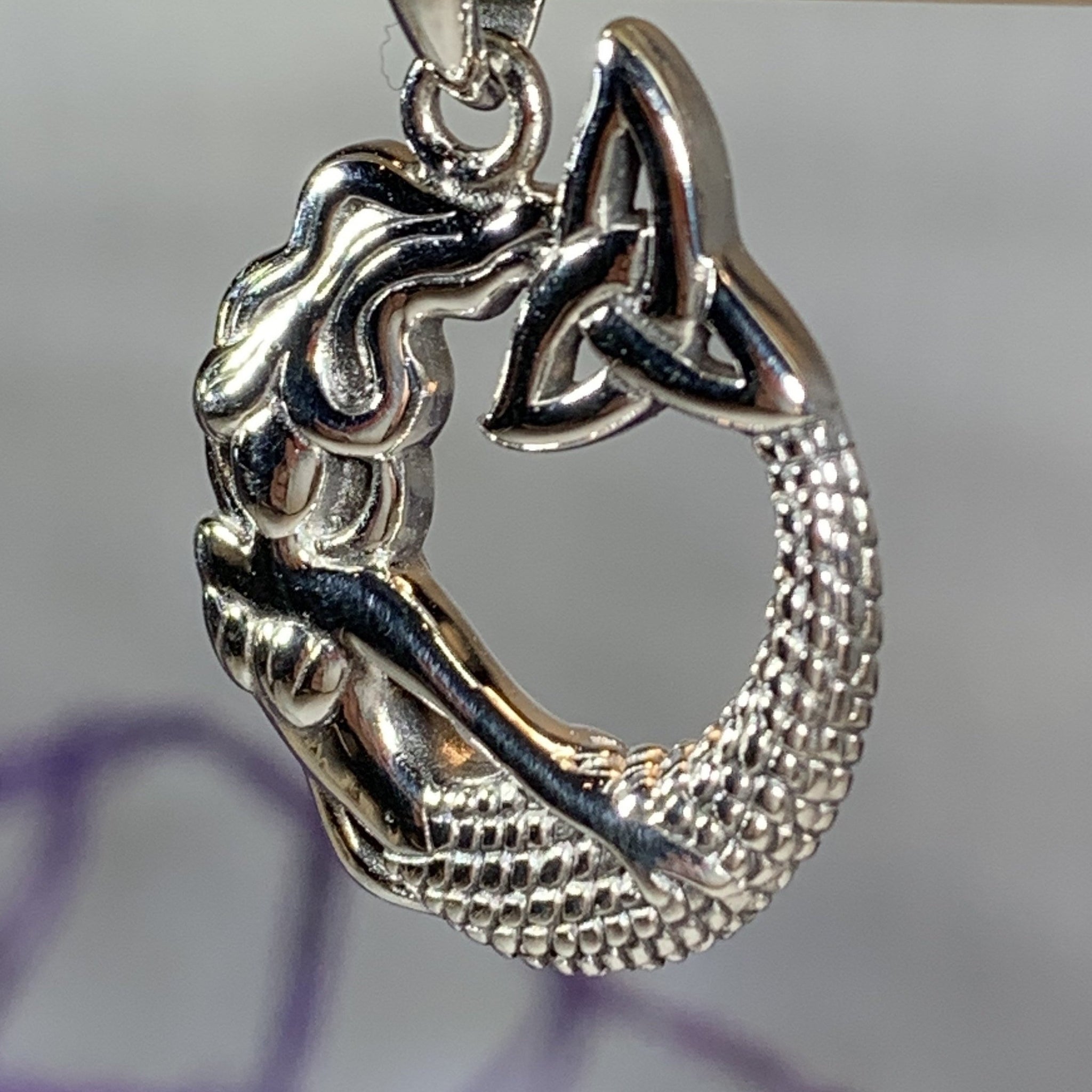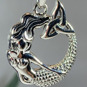This playful mermaid pendant, crafted from solid sterling silver, features whimsical Celtic Trinity Knot accents on her tail, making it a delightful gift.