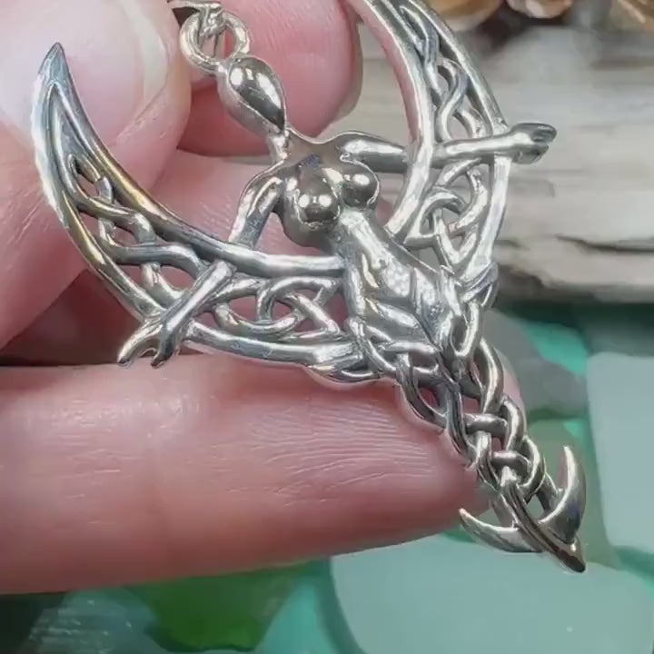 Adorned with intricate Celtic Knotwork, this sterling silver Goddess casts her lunar energies and is the perfect symbol of feminine power.