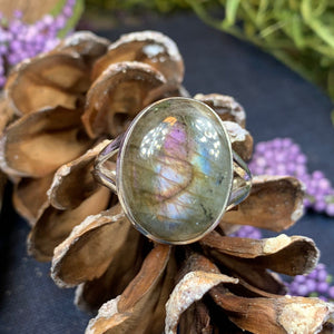 This Solid Sterling Silver Celtic Magic ring with a Purple Flash Labradorite stone and a Celtic inspired band.