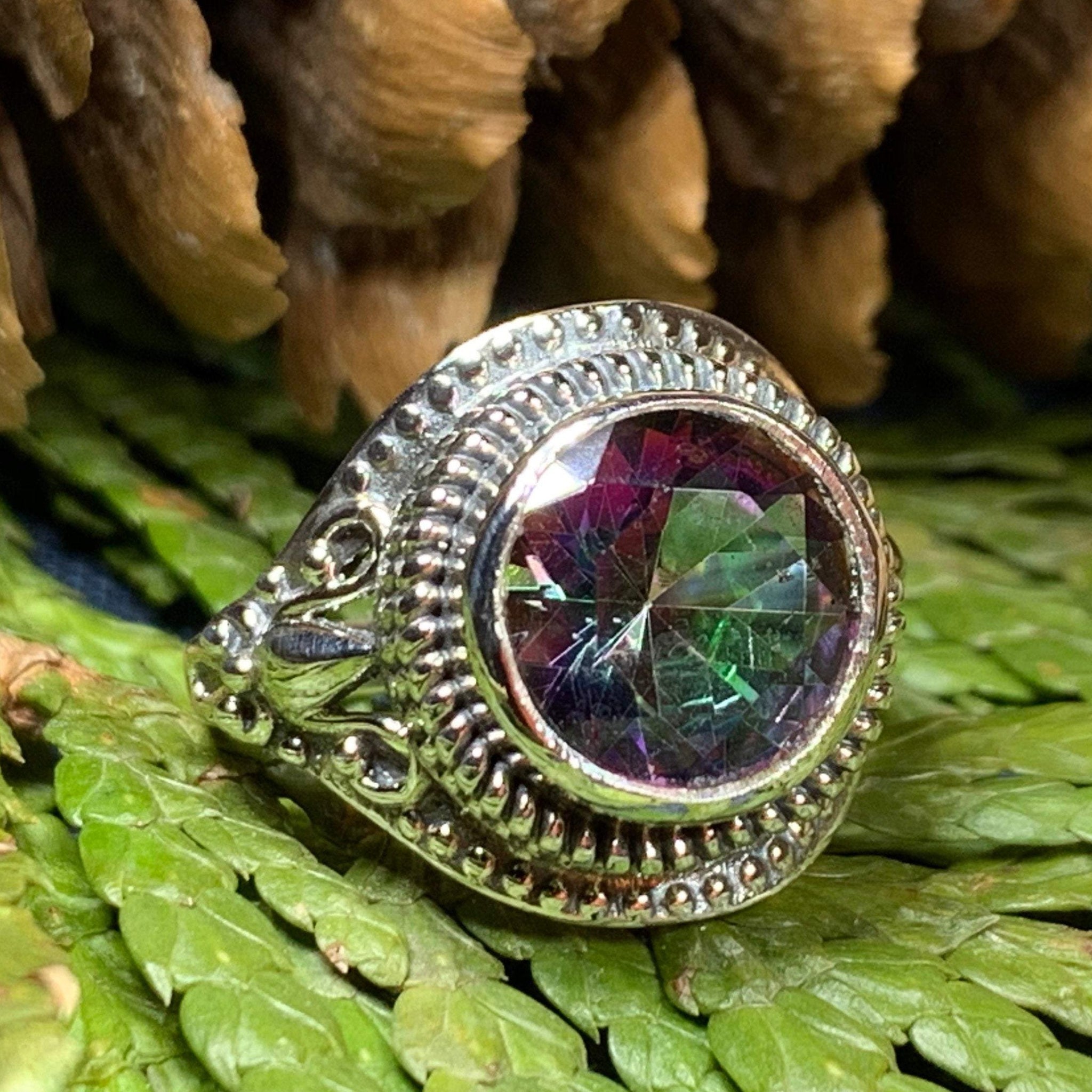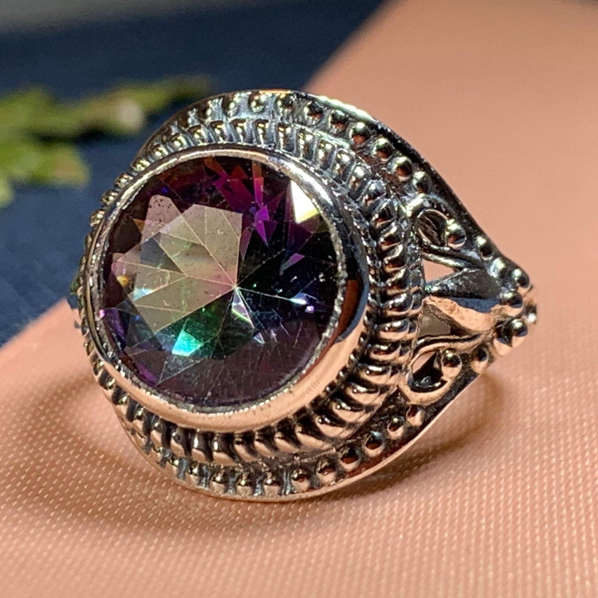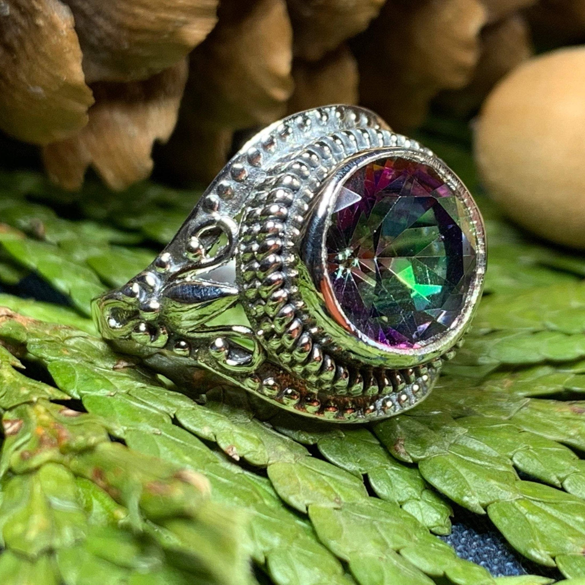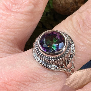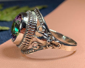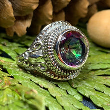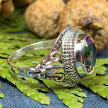 The Eloise Celtic Mystic Topaz Ring elegantly merges timeless Celtic artistry with contemporary style. Crafted from solid sterling silver, this exquisite piece features a stunning 1 1/2 carat faceted mystic topaz that captivates with its vibrant, shifting colors.