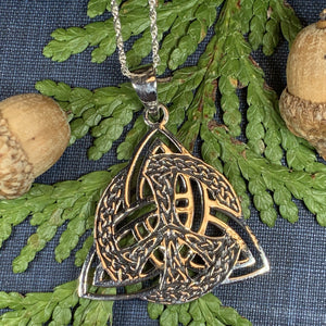 This Celtic Peace Sign Necklace features delicate Celtic knotwork and a prominent Peace Sign at the center, blending traditional Celtic design with the universal symbol of peace.