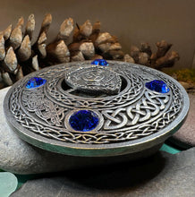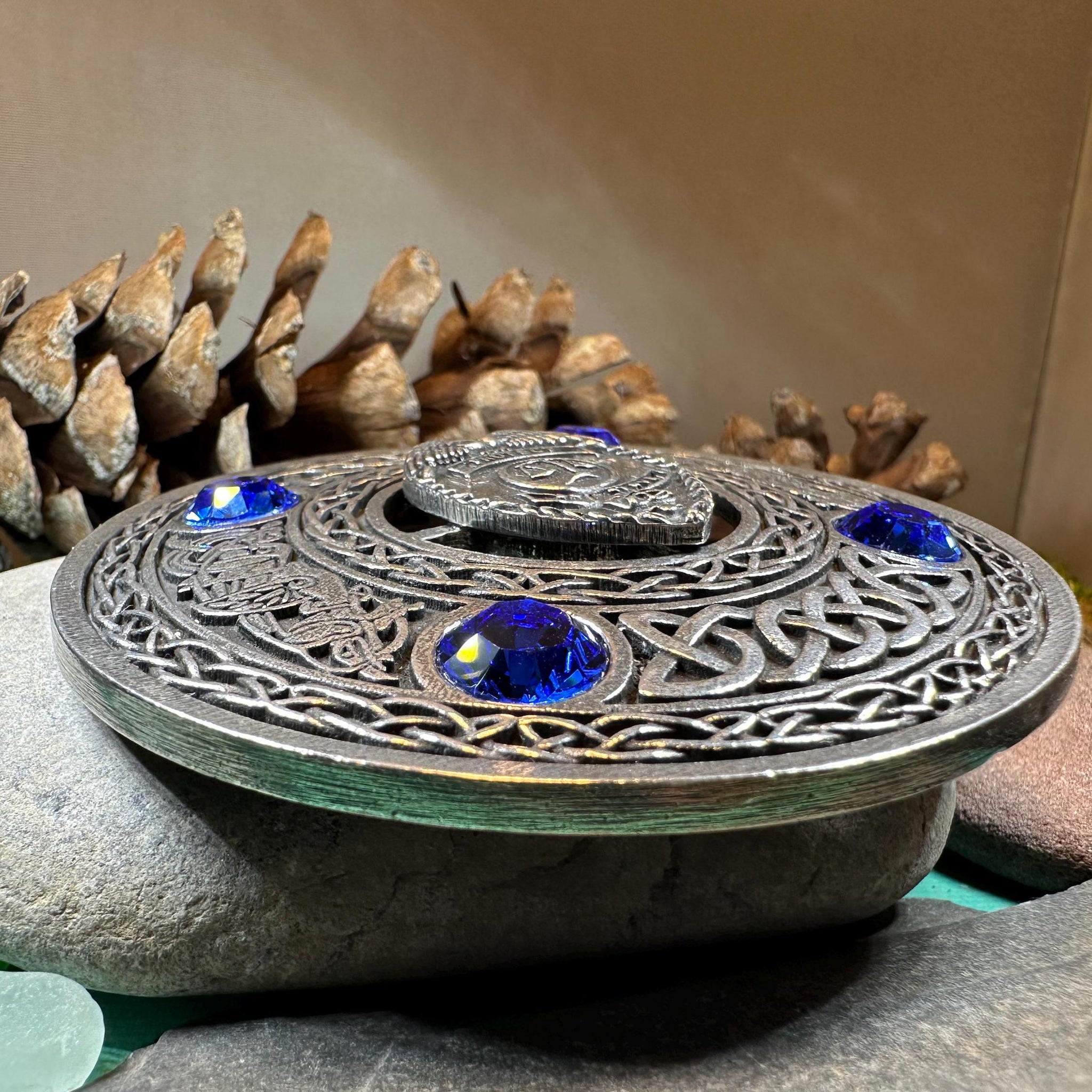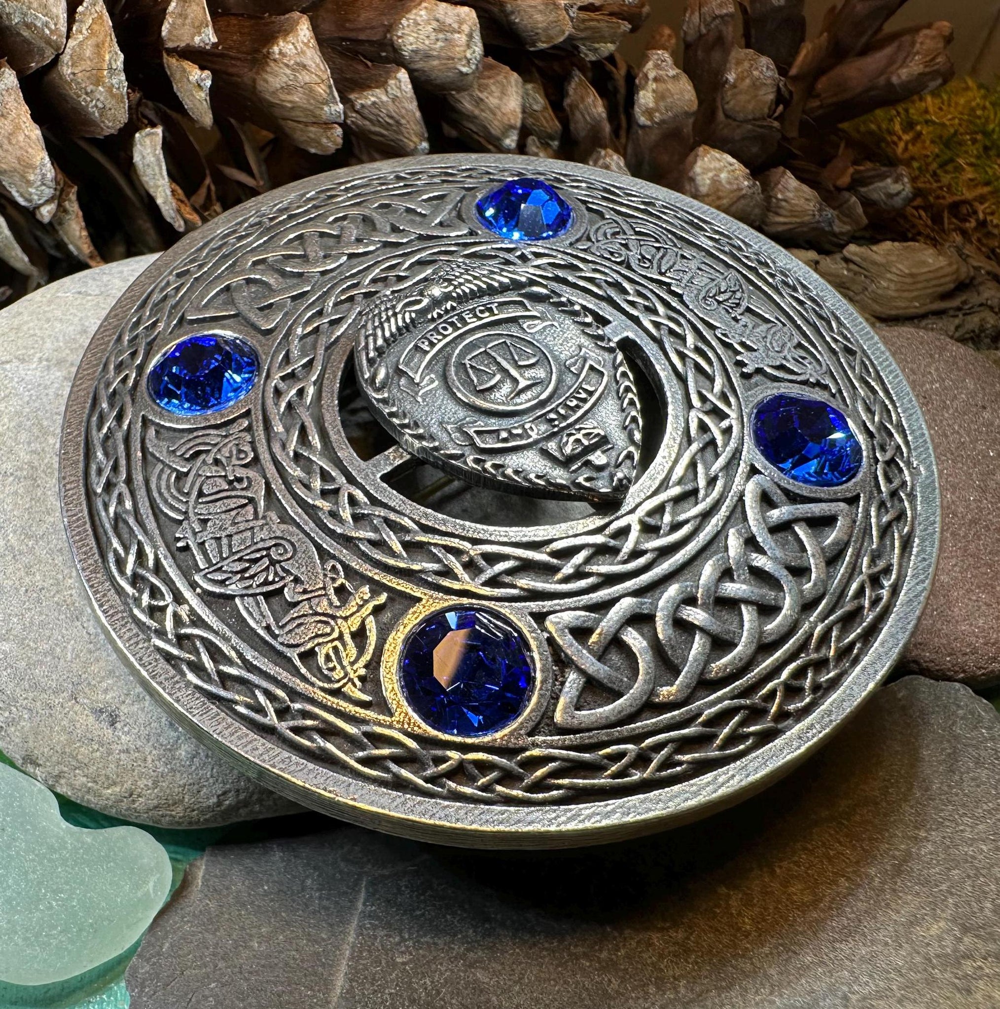 Crystal Celtic Police Department Brooch – a pewter shoulder style brooch that has a large 1 inch center Protect & Serve Badge and four surrounding crystals in blue color. A beautifully detailed brooch that features a Celtic design with classic Celtic knotwork. Perfect for a kilt, tartan, coat or sweater.