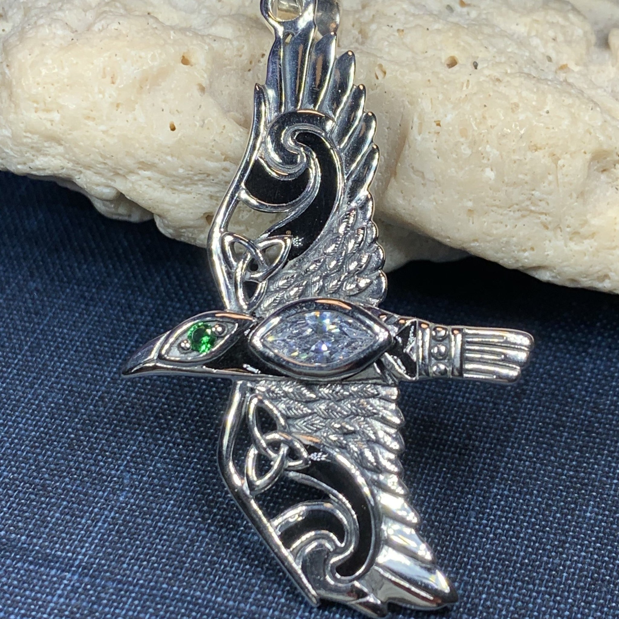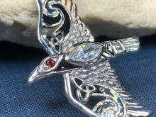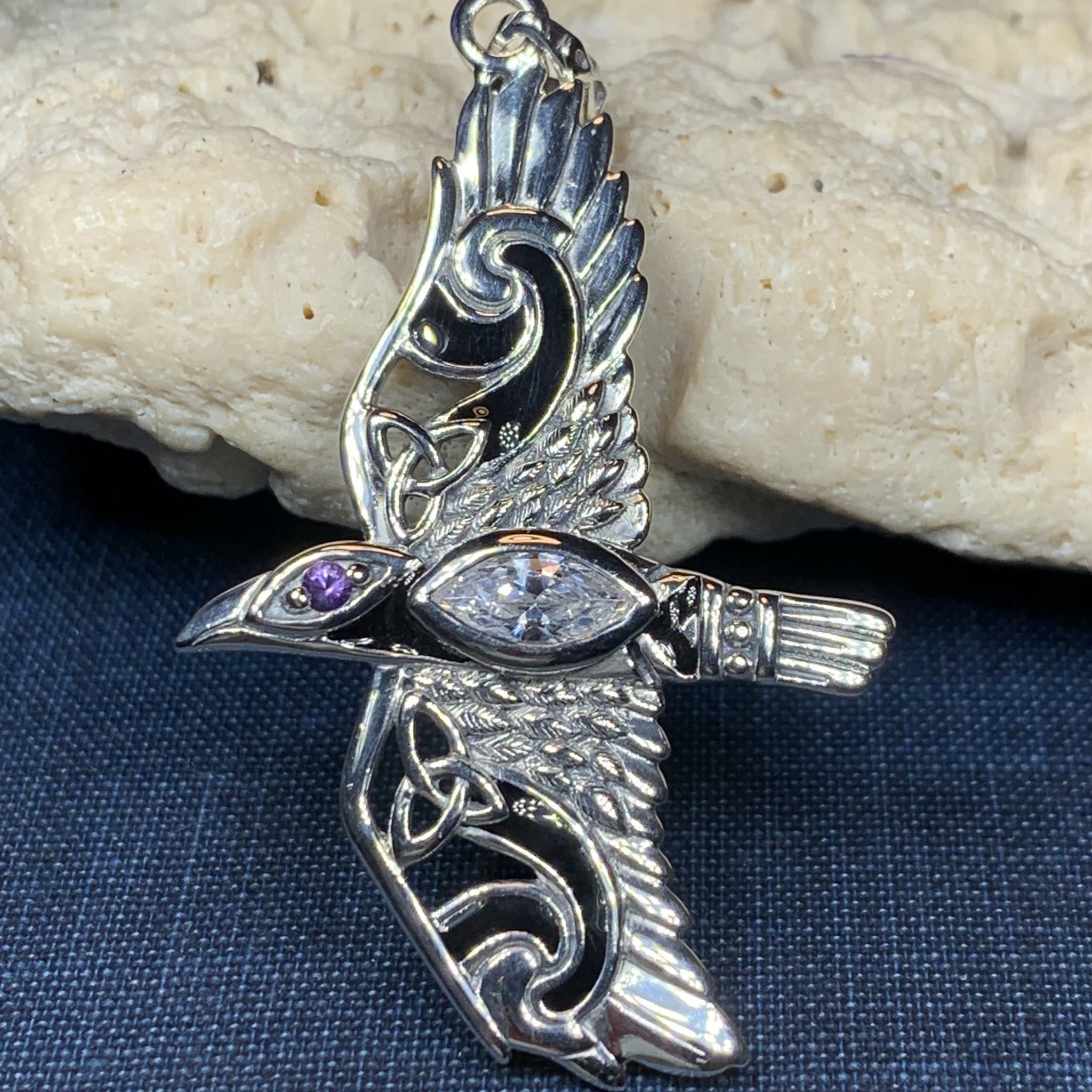 Each raven has a large diamond zirconia stone on the body and your choice of gemstone for the eye: emerald crystal, diamond zirconia, moonstone, amethyst, garnet or blue topaz.