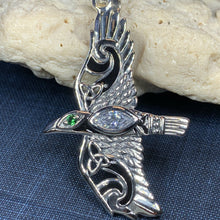 Black enamel work highlights the Celtic knotwork on the wings of the bird.