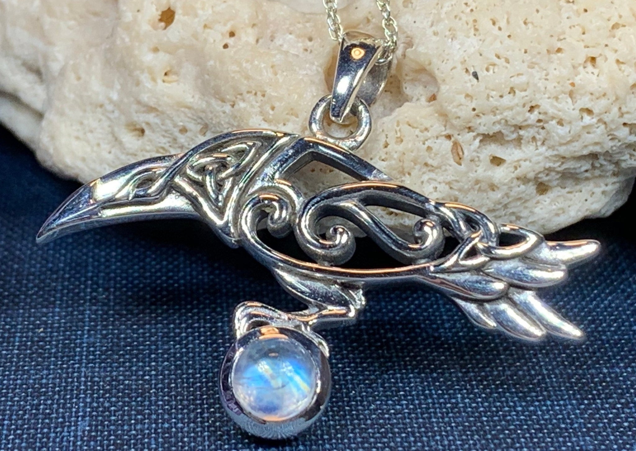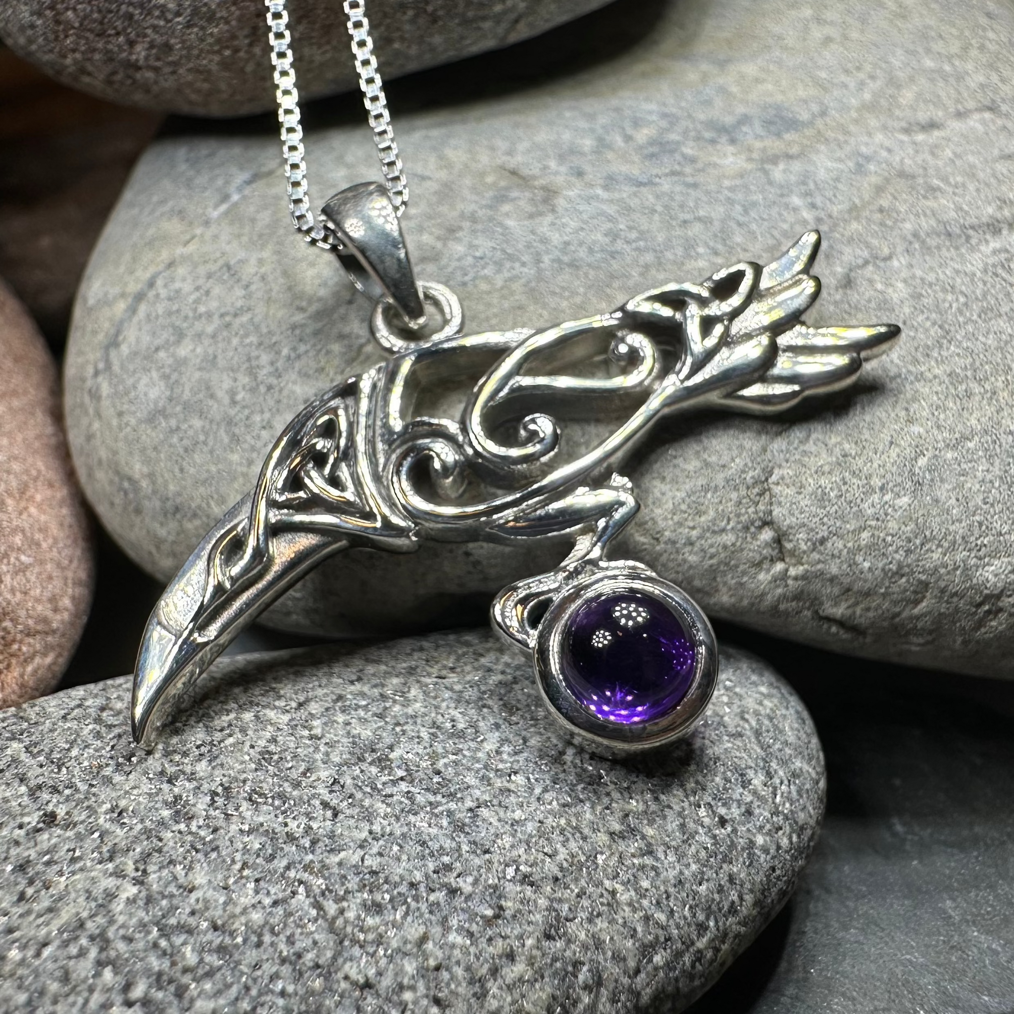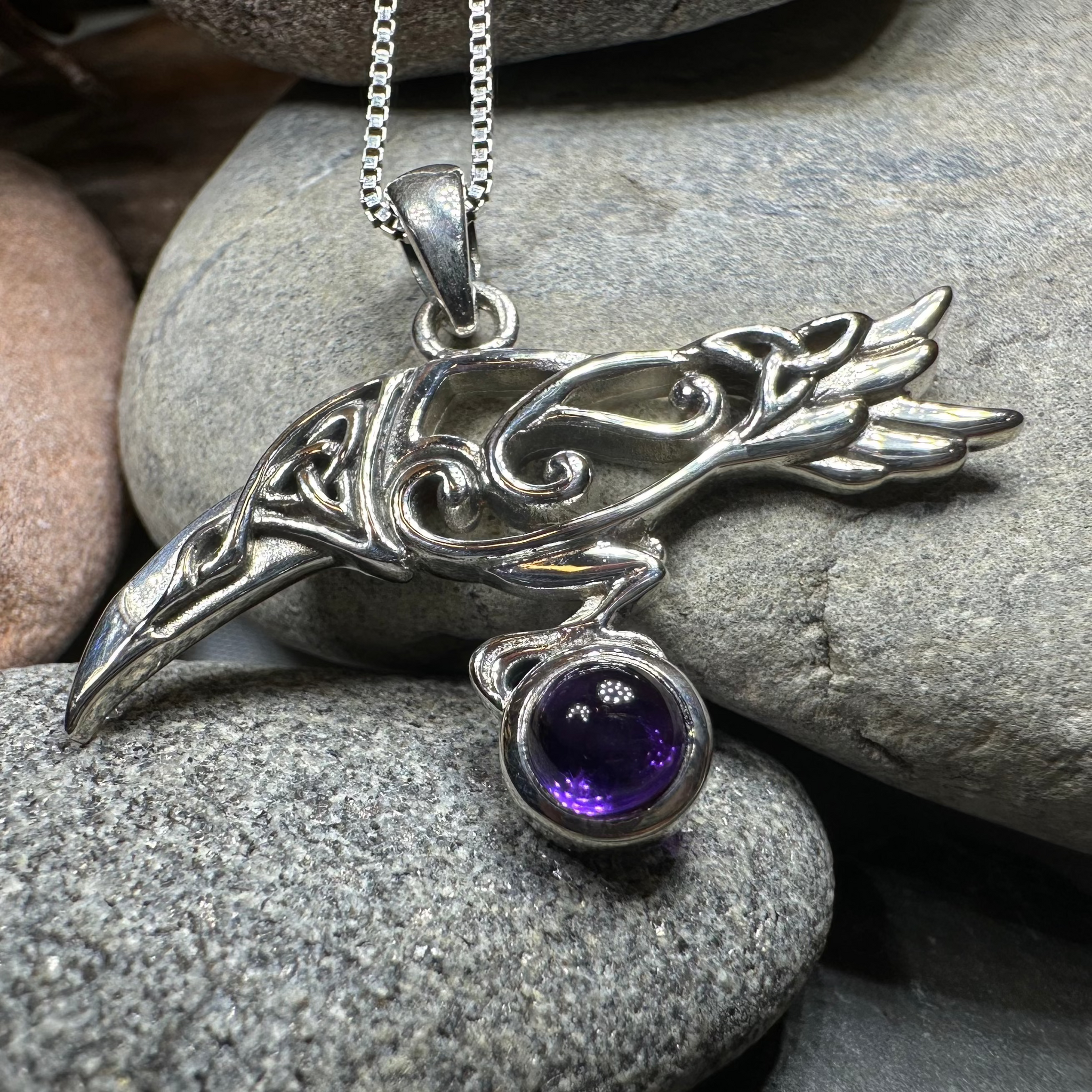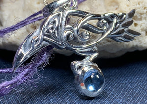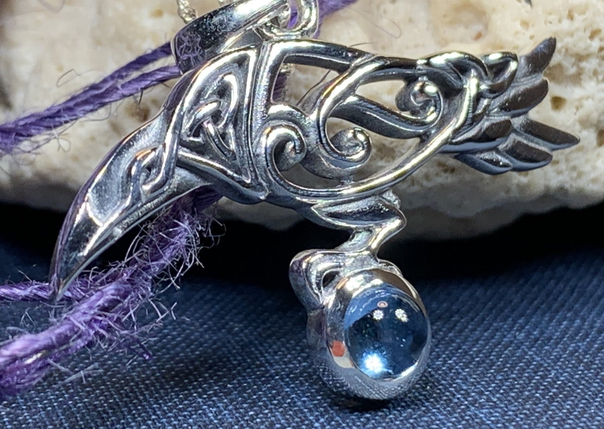 The mythical wisdom of a Raven ~ Solid Sterling Silver Necklace with a Celtic knot center and trinity knots in the neck and tail - perched upon a genuine cabochon gemstone of your choice.