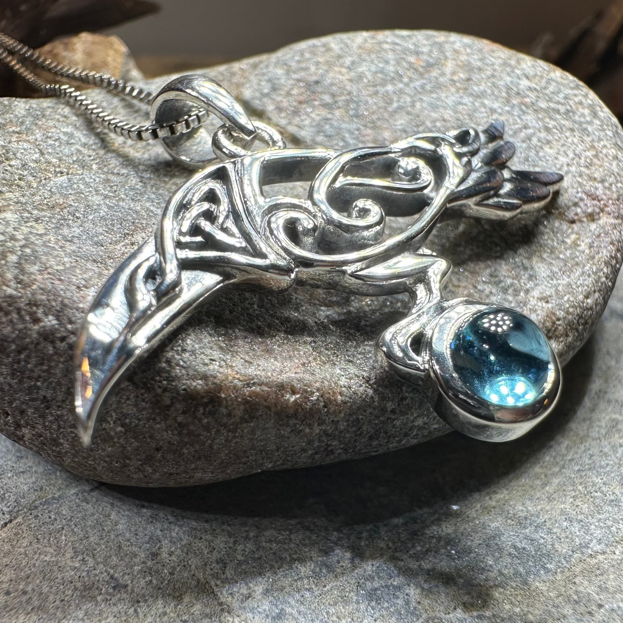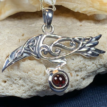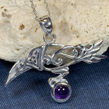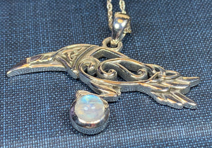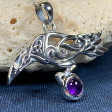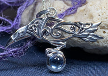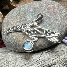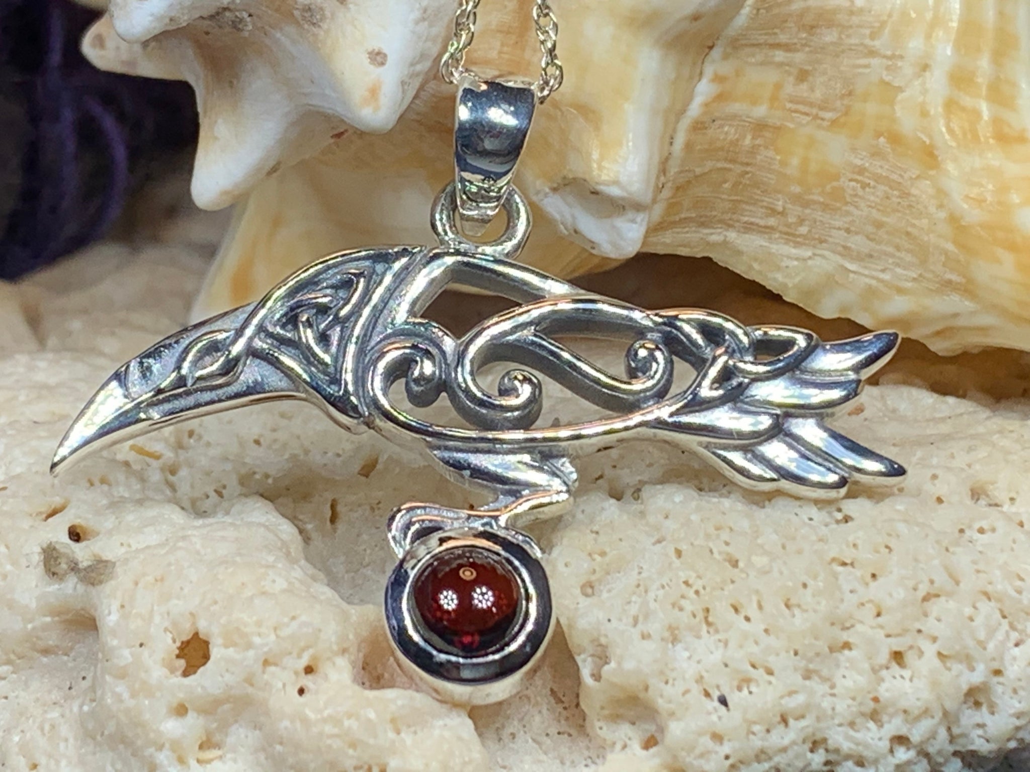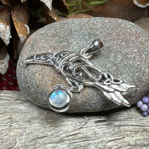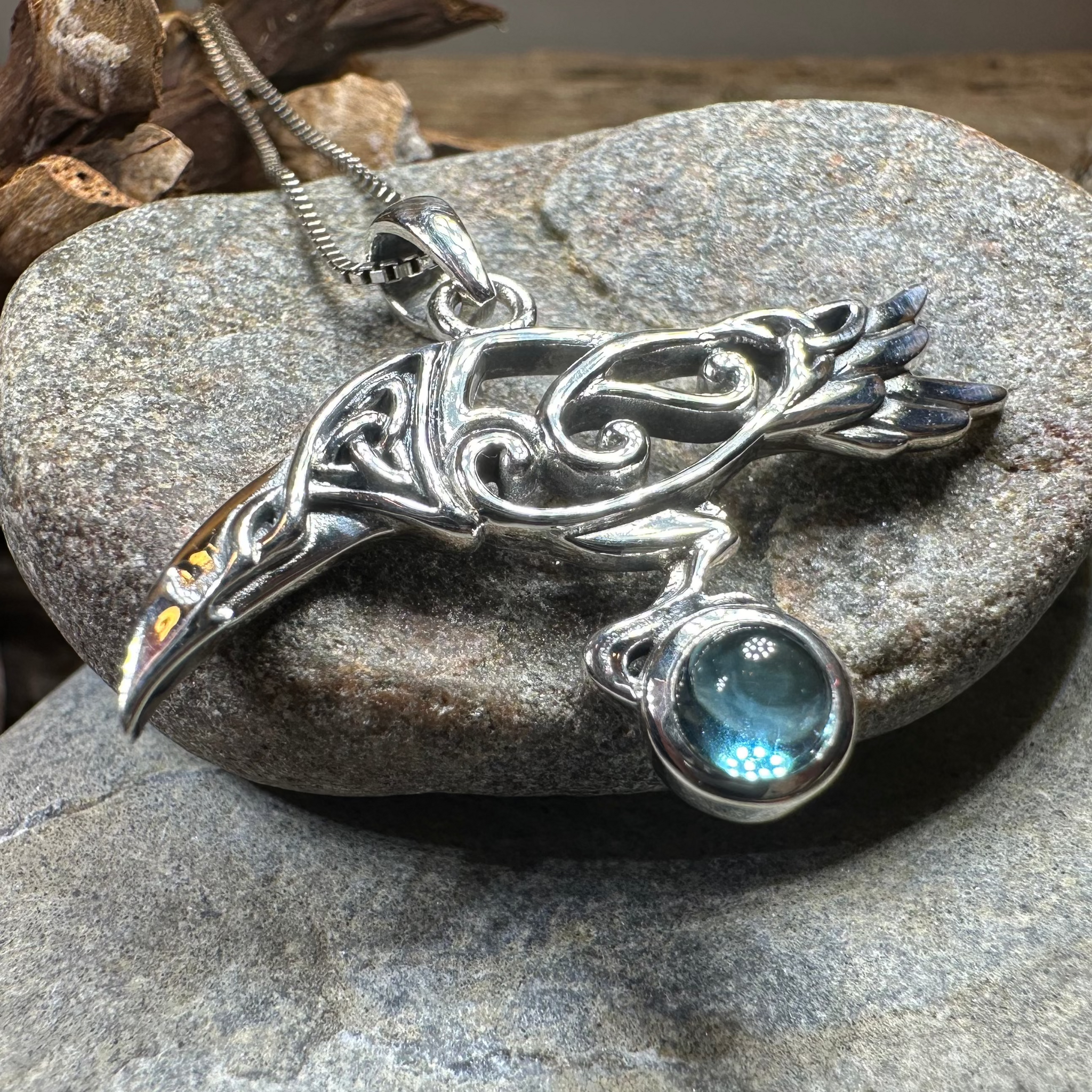 The mythical wisdom of a Raven ~ Solid Sterling Silver Necklace with a Celtic knot center and trinity knots in the neck and tail - perched upon a genuine cabochon gemstone of your choice.