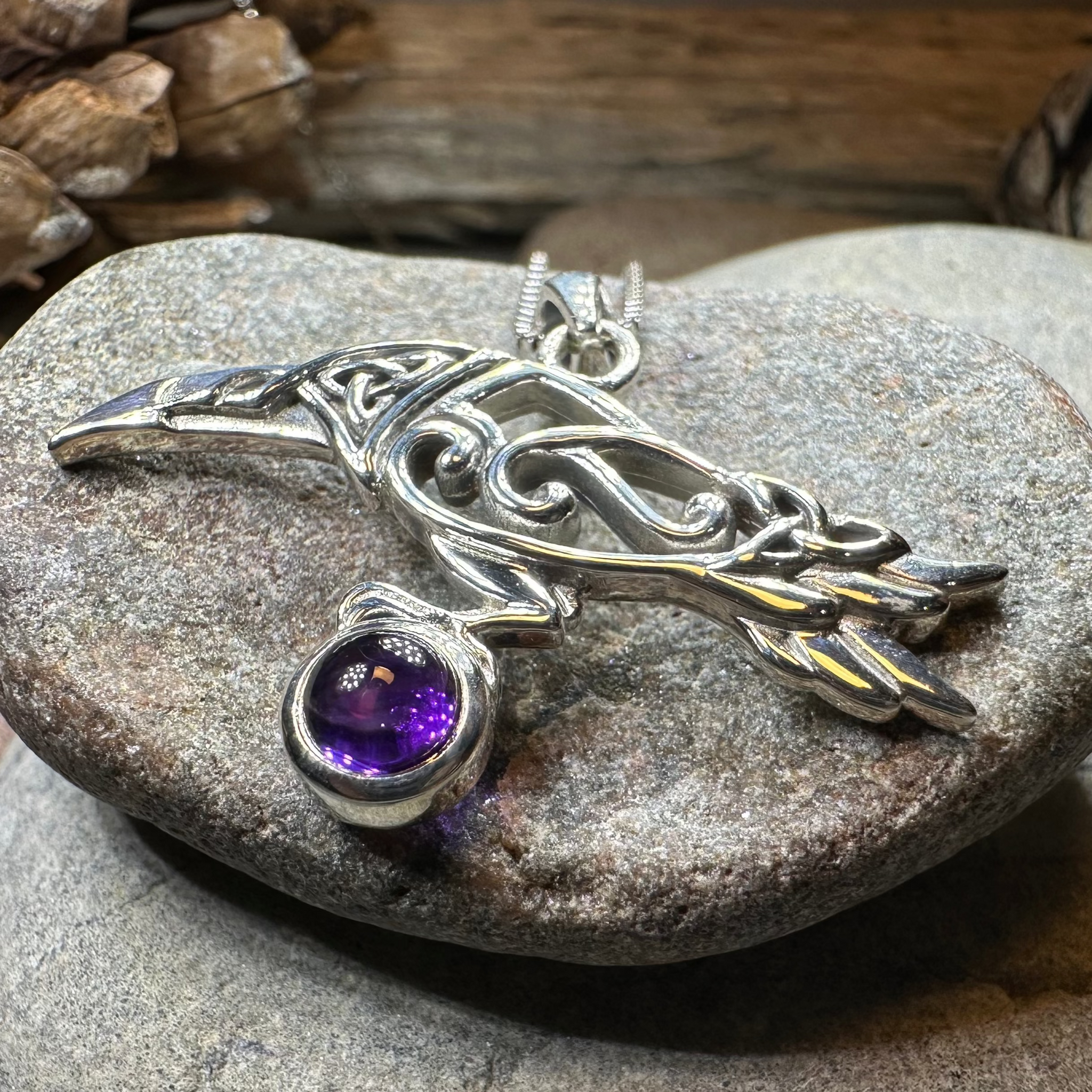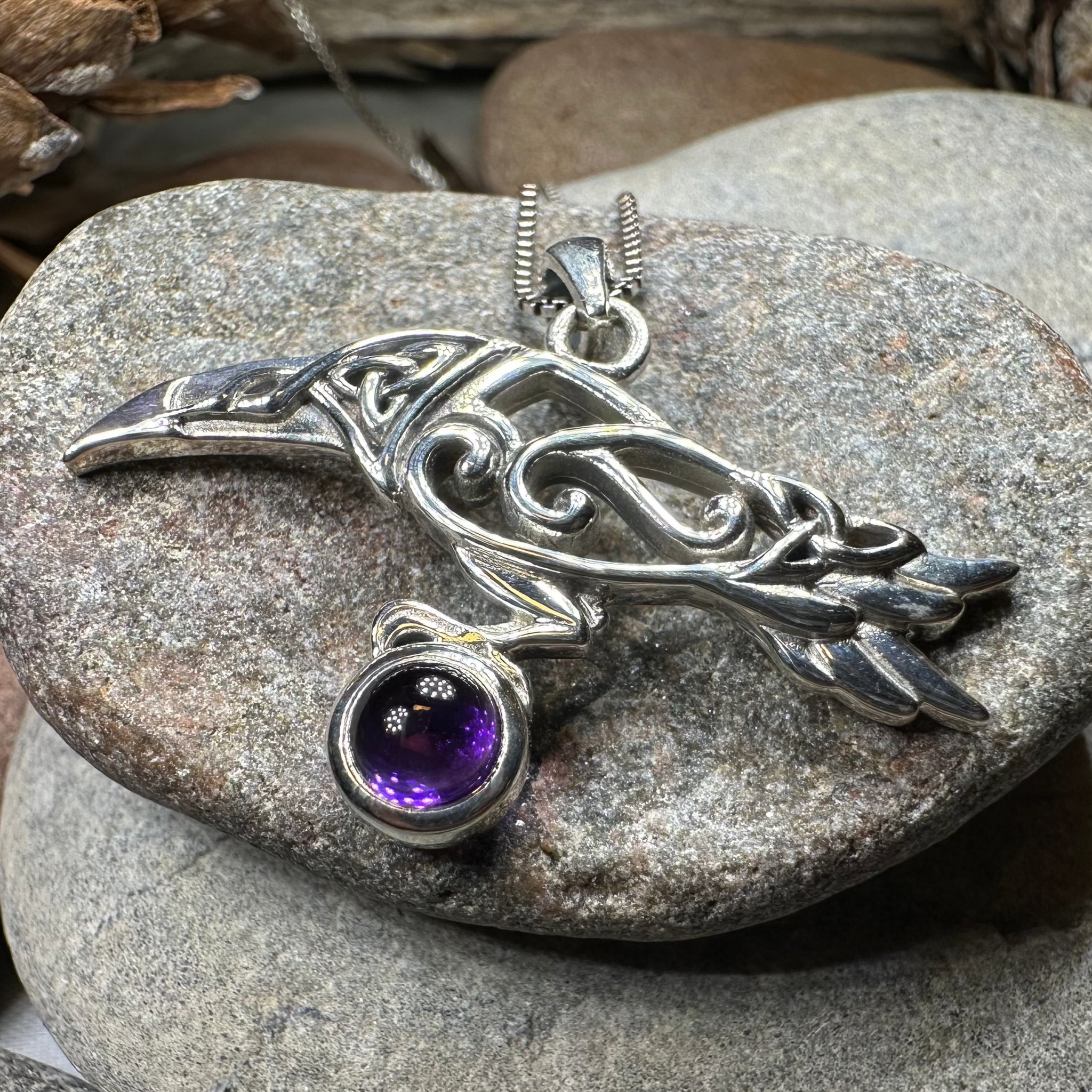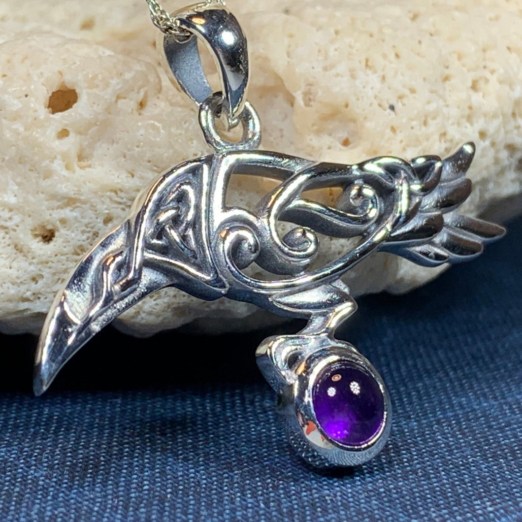 Each raven has your choice of gemstone for the eye: moonstone, amethyst, garnet or blue topaz.