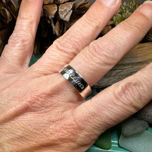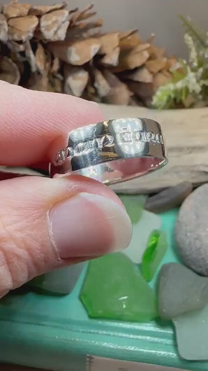 Band is 8mm wide in solid sterling silver. Lettering is on both sides of the band.