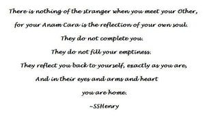 Anam cara is an old Gaelic term, meaning ‘soul friend’, or ‘Soulmate’. Anam is Gaelic for ‘soul’, and cara is Gaelic for ‘friend’. To say ‘my soul friend’ you would say ‘mo anam cara.’