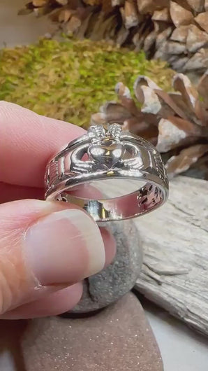 Solid Sterling Silver Celtic Claddagh Ring with Celtic Knotwork.