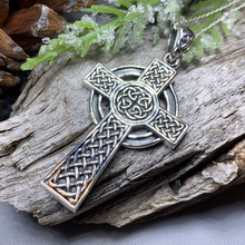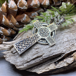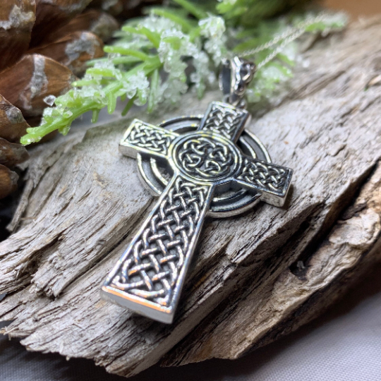 This knotwork cross pendant is cast in sterling silver and has an intricate design reminiscent of classic Celtic crucifixes. Makes a beautiful gift.