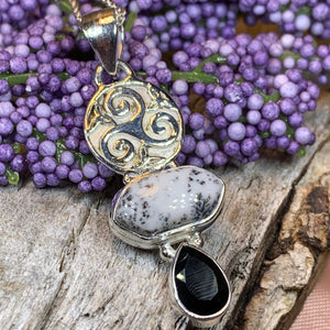 Solid Sterling Silver with authentic gemstones: white dendritic opal with faceted black onyx.