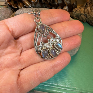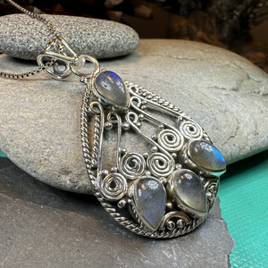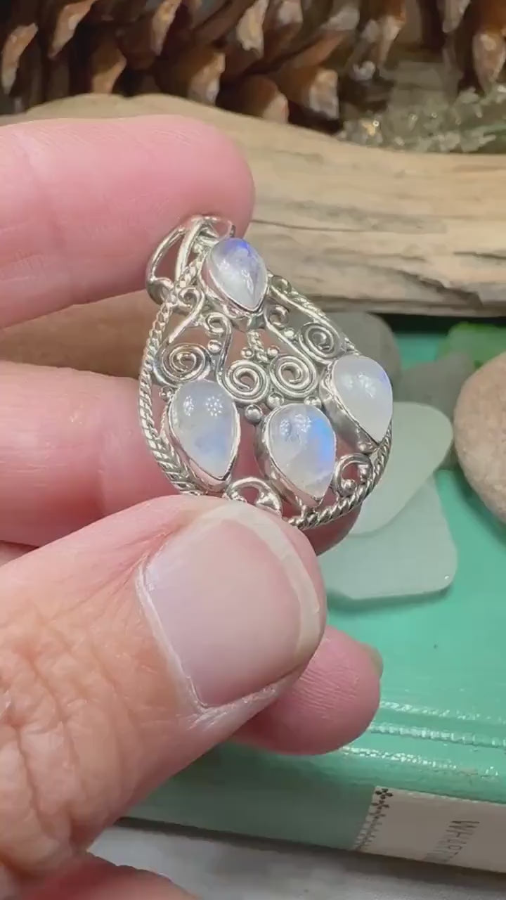 This Solid Sterling Silver Gemstone Moonstone pendant is adorned with four lovely 1 carat Rainbow Moonstone or Blue Labradorite gemstones.