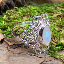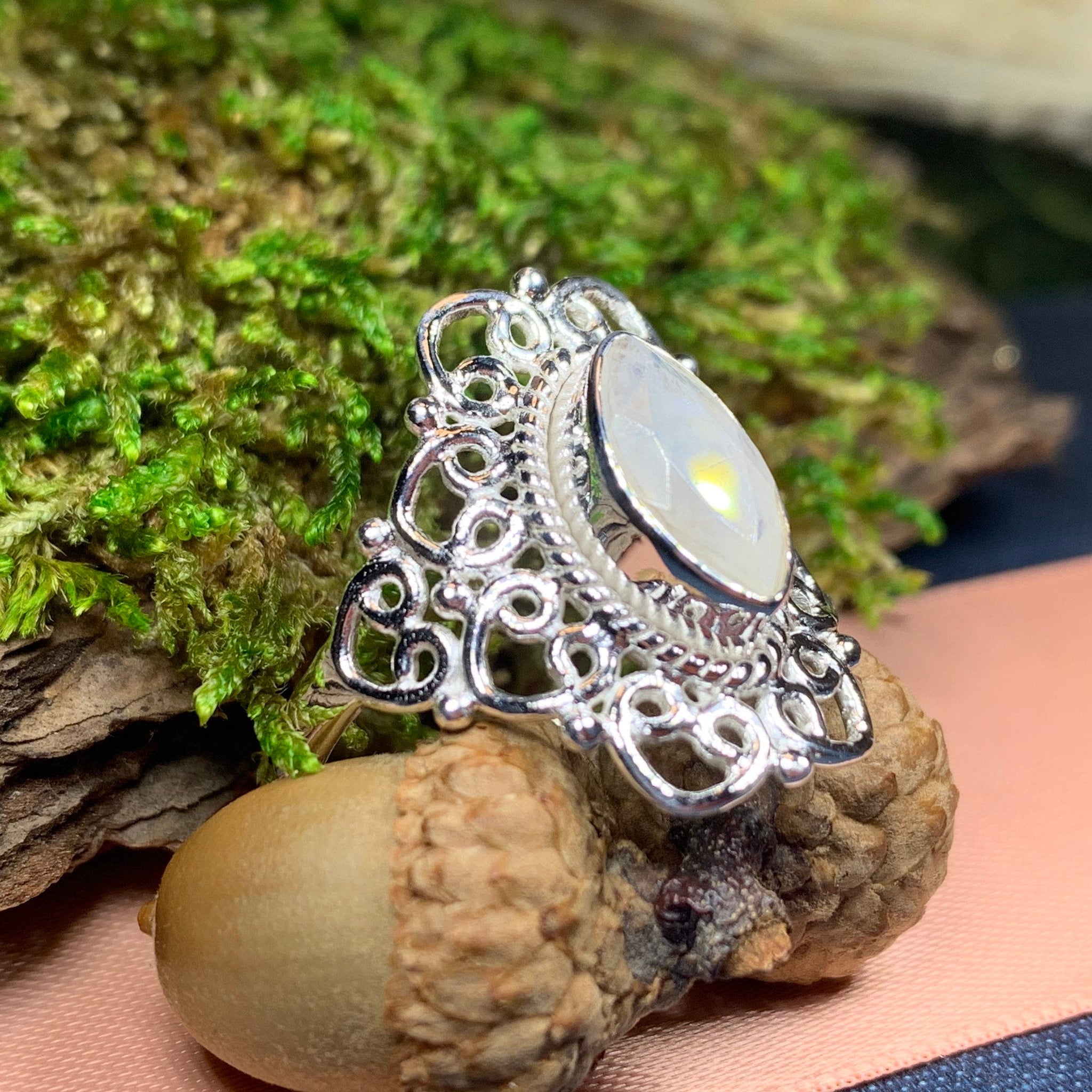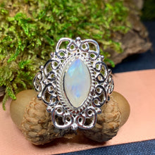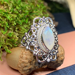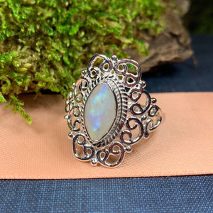This Solid Sterling Silver Celtic Knotwork ring with a faceted rainbow moonstone gemstone.