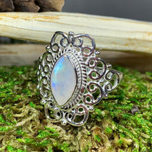 The ring is adorned with a large 5 carat faceted Rainbow Moonstone that glows with amazing fire! This beautiful ring is an artful rendition of the traditional Celtic spiral.