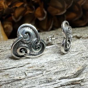 Attractive and detailed Celtic Triskele stud earrings that feature a classic Celtic design. Solid sterling silver with a push back closure.